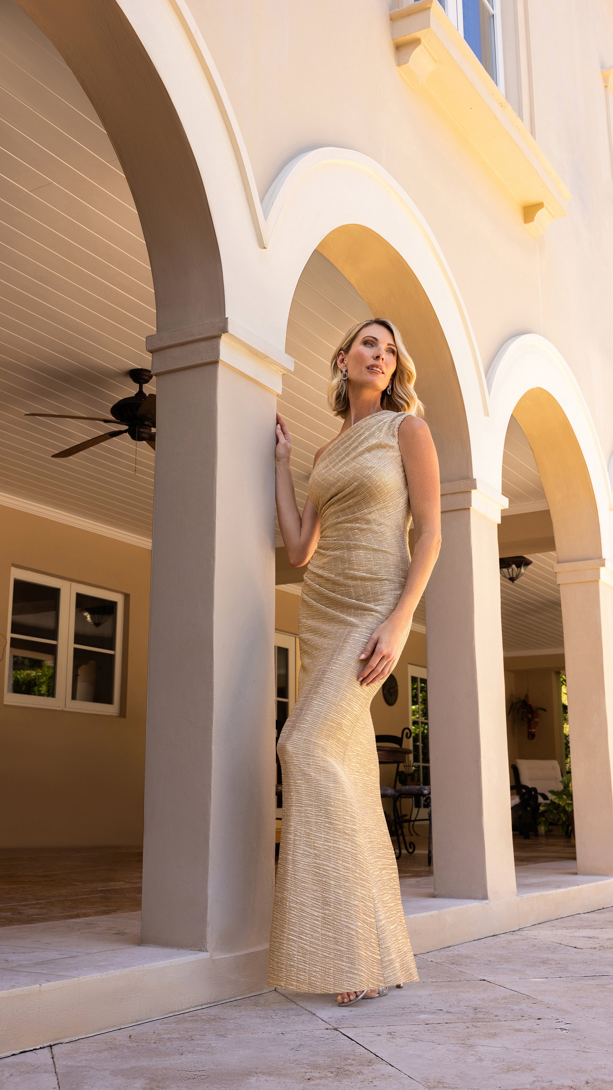 "Kaia" Metallic Crinkle Boat Neck Drape Sleeve Floor Length Dress