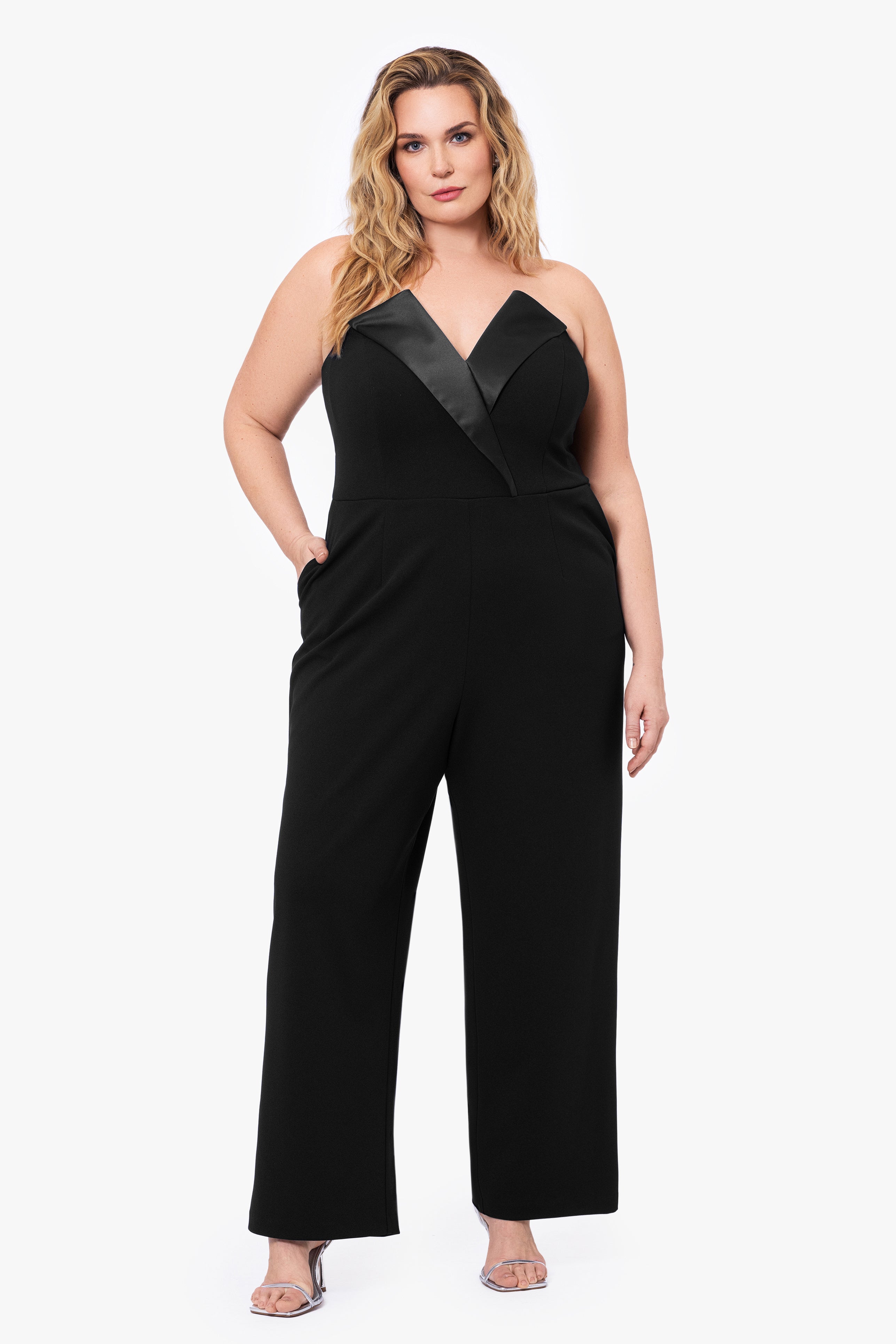 The Plus "Tasha" Jumpsuit is a chic and modern choice for plus-size women, offering a bold and sophisticated style. This strapless tuxedo jumpsuit combines classic tailoring with contemporary elegance, featuring a flattering strapless neckline that highlights the shoulders and collarbone. The tailored fit accentuates curves while providing a sleek silhouette, and the tuxedo detailing adds a touch of formal sophistication. Ideal for both upscale events and stylish gatherings, the "Tasha" Jumpsuit is designed to make a confident, fashion-forward statement.