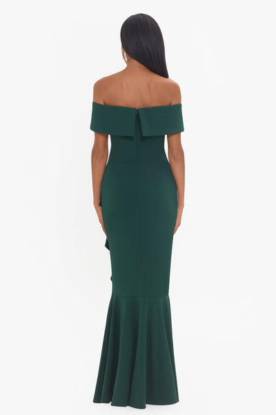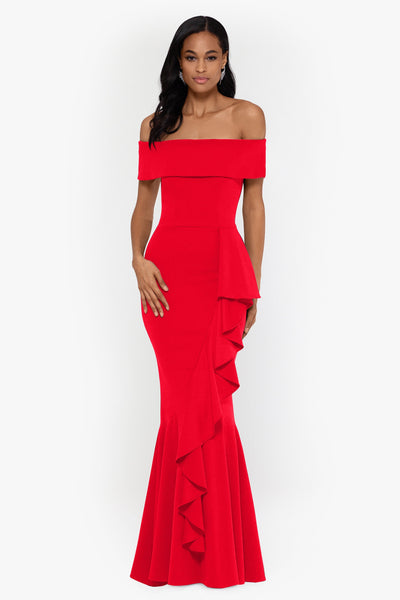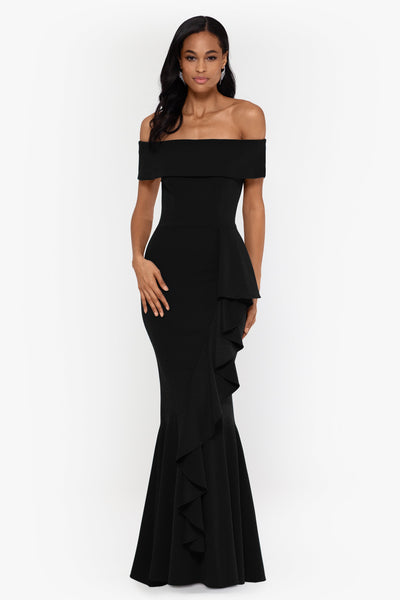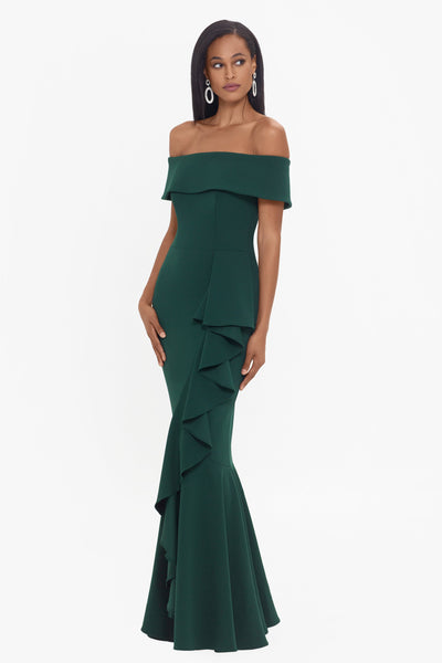 - Details: Off the Shoulder, Floor Length Dress, Side Ruffle Detail