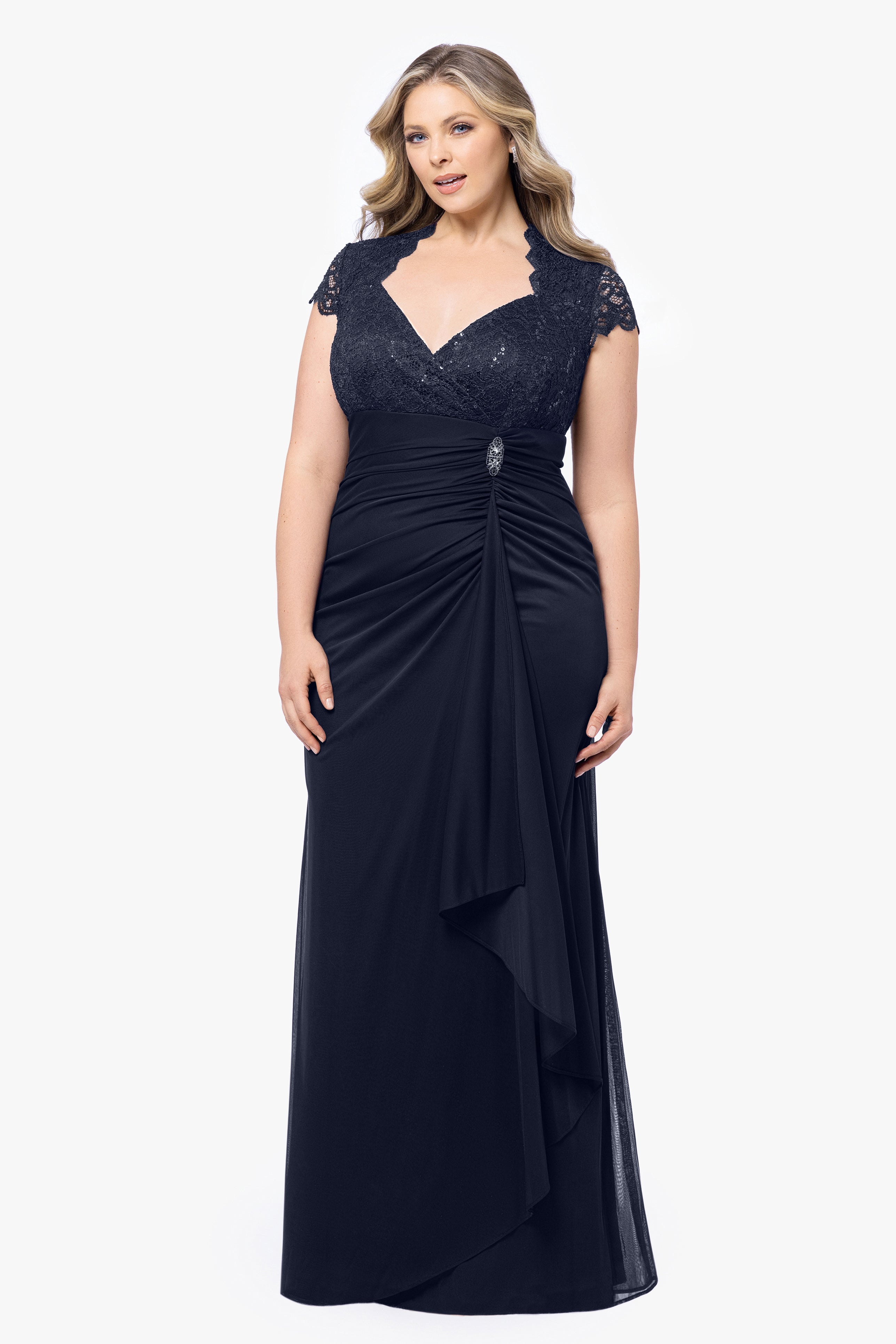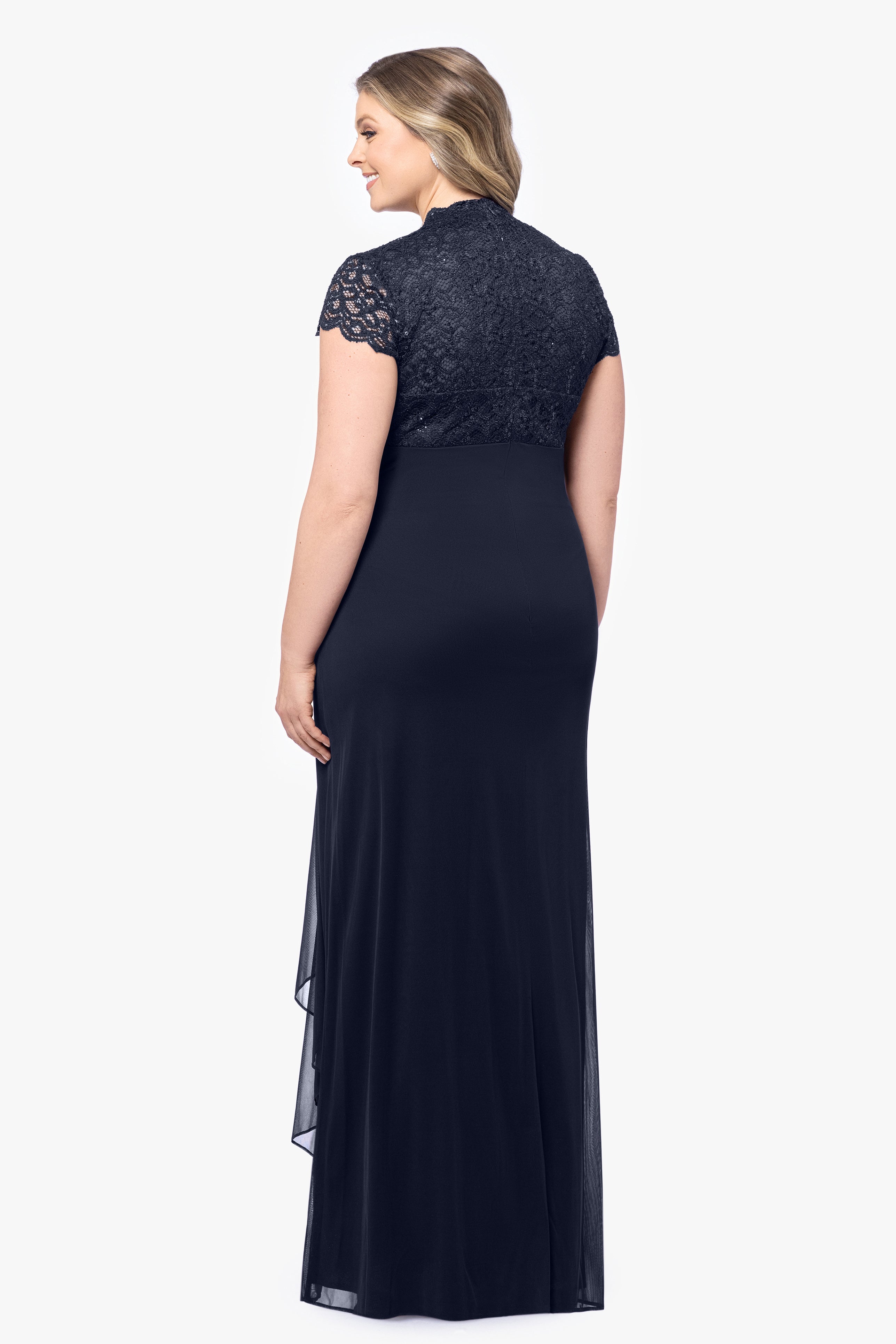 Plus "Kim" Sheer Matte Jersey Lace Cap Sleeve Dress