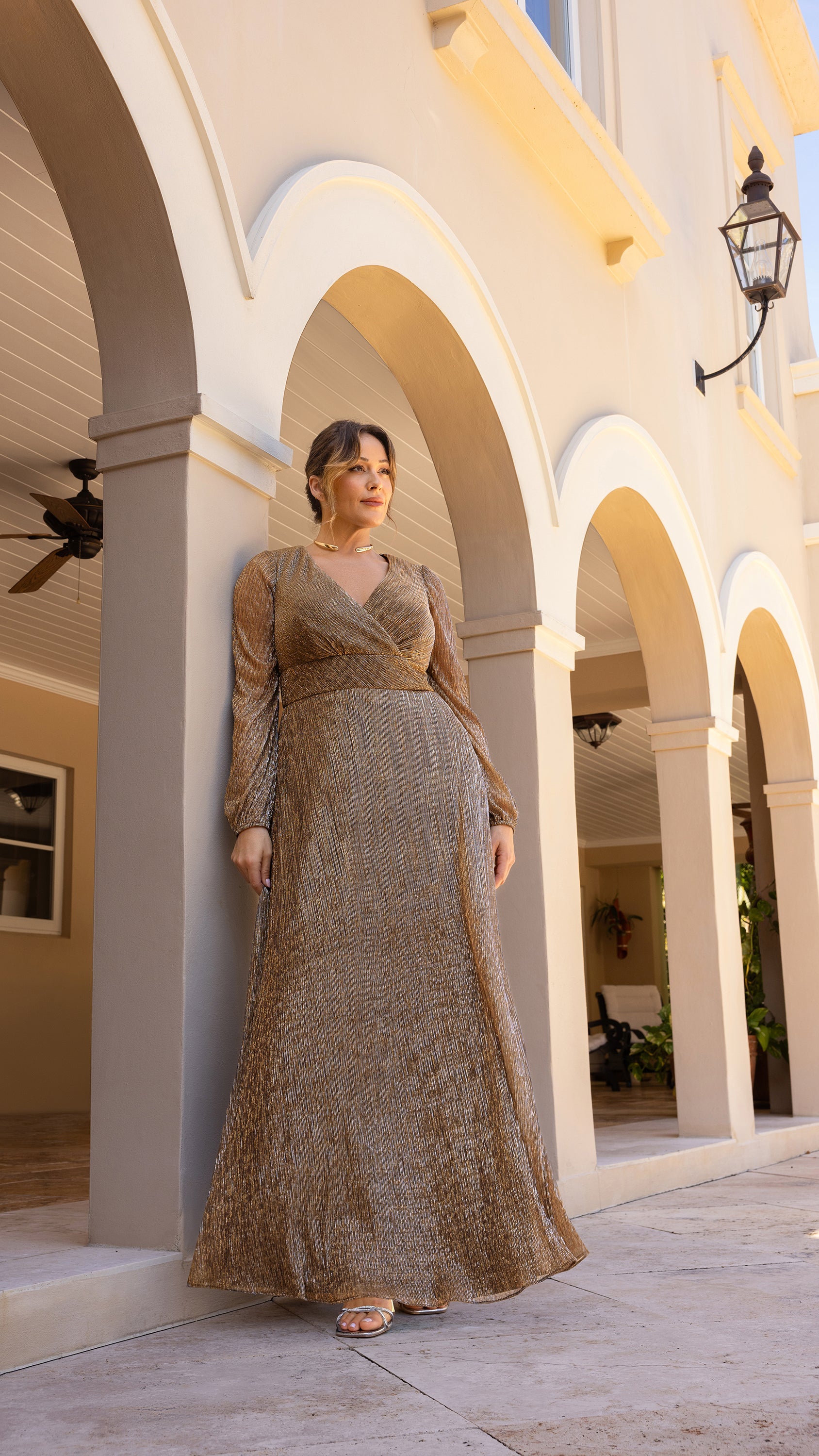 "Kaia" Metallic Crinkle Boat Neck Drape Sleeve Floor Length Dress