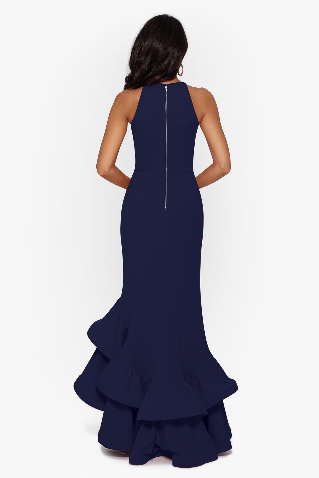 "Arielle" Scuba Crepe Ruffle Slit Gown
