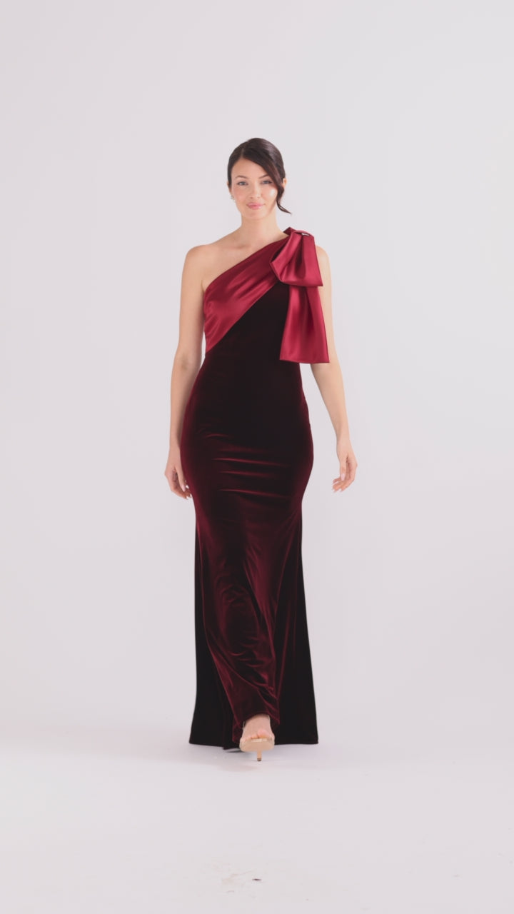 "Elena" Velvet One Shoulder Satin Bow Neckline Floor Length Dress