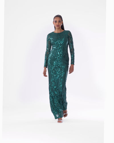 This stunning full-length gown features intricate all-over sequin detailing, creating a captivating shimmer perfect for evening events or formal occasions. Designed with a flattering fitted silhouette and long sleeves, it offers both elegance and sophistication. Ideal for galas, weddings, or special occasions, this dress will make you stand out with its luxurious and timeless design.