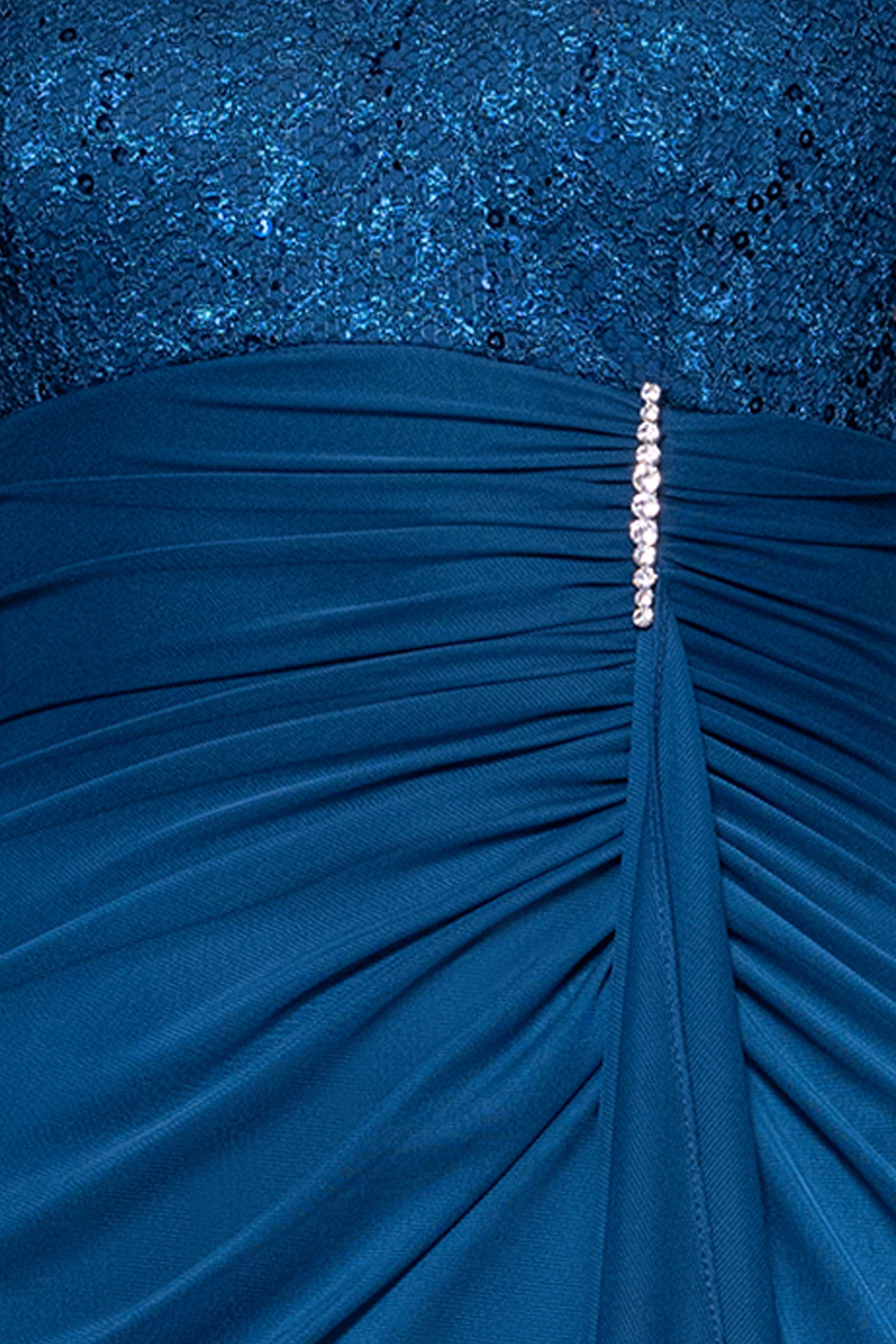 This elegant gown features delicate lace sleeves and a ruched waistline that flows into a flattering ruffled skirt. The sparkling embellishment at the waist adds a subtle touch of glamour, making it perfect for formal events. Its graceful design ensures a flattering fit, while the romantic lace detailing adds a timeless and sophisticated charm.