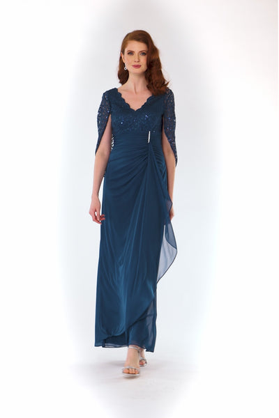 "Carmyn" Long Sheer Matte Jersey and Lace Cape Sleeve Floor Length Dress
