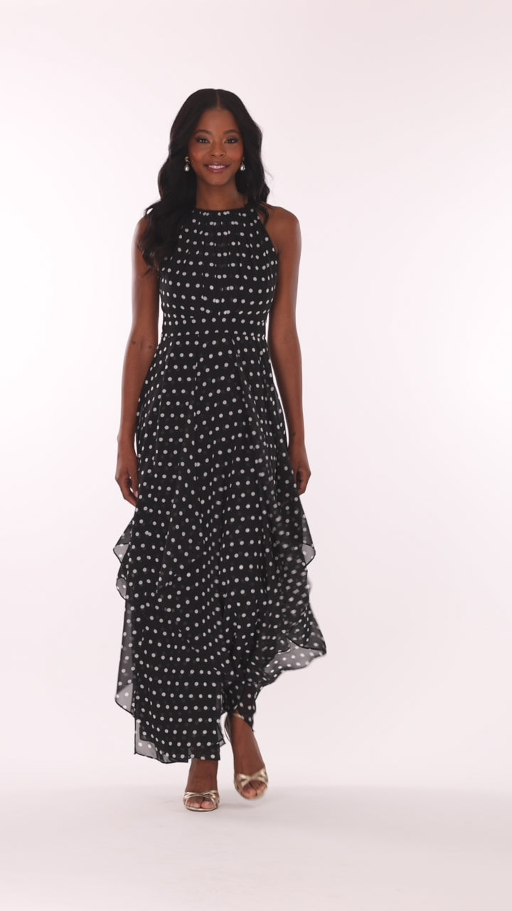 Playful yet polished, this polka dot chiffon gown features a high neckline, a flattering cinched waist, and a layered handkerchief hem that adds soft movement with every step—perfect for brunches, garden parties, and everything in between.