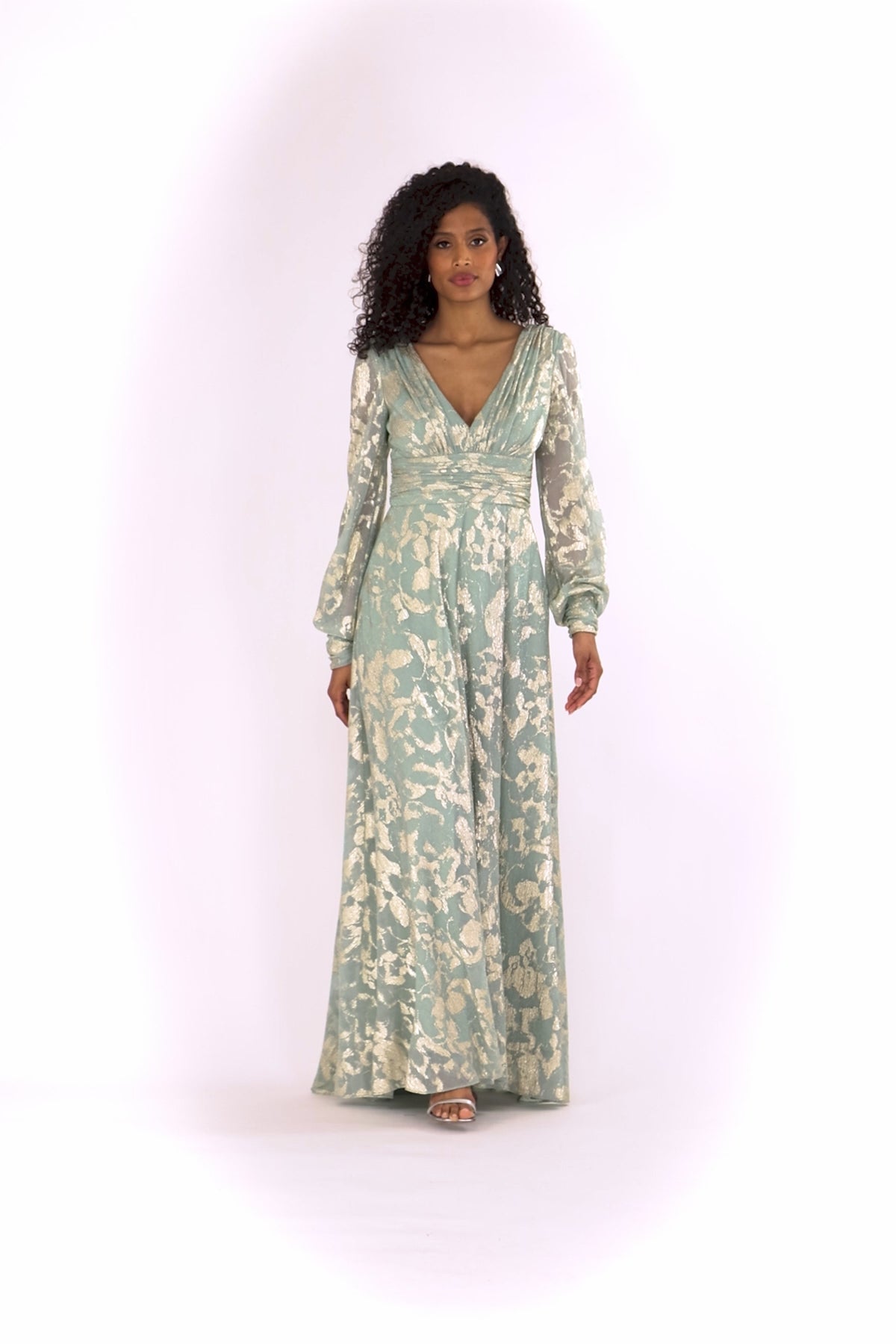 "Melanie" Foil Knit V-Neck Long Sleeve Floor Length Dress