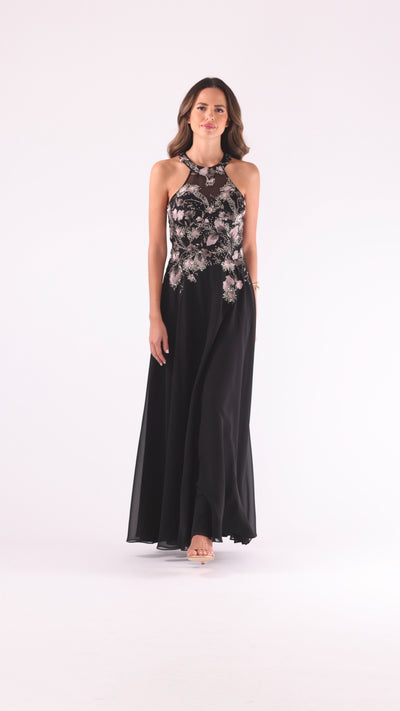 "Maryse" Chiffon Embroidered Bodice Floor Length Dress