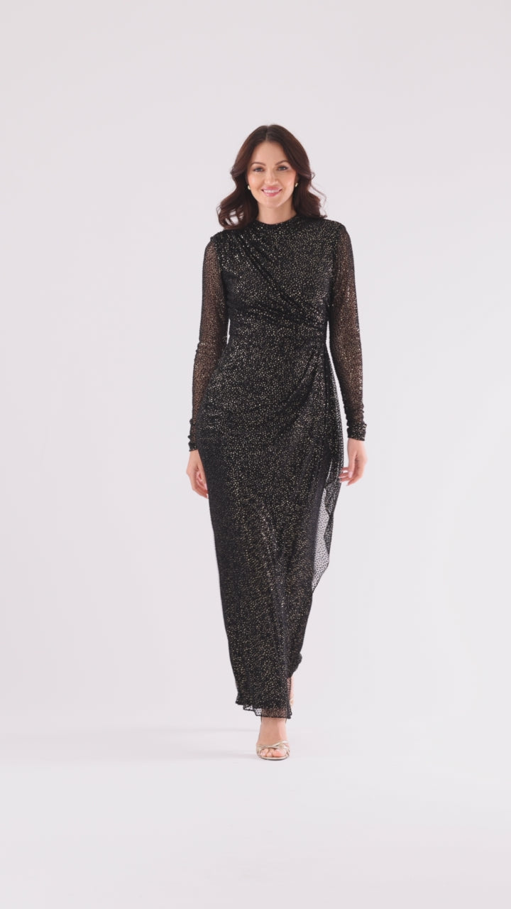 Elevate your evening wardrobe with this velvet burnout dress featuring elegant long sleeves and a floor-length silhouette. Crafted from luxurious fabric, it offers a soft texture and subtle sheen that enhances its sophisticated charm. The unique burnout pattern adds depth and allure, making it perfect for formal events or upscale gatherings. Designed to flatter with a graceful drape, this dress combines timeless style with comfortable wear, ensuring you make a refined statement wherever you go.