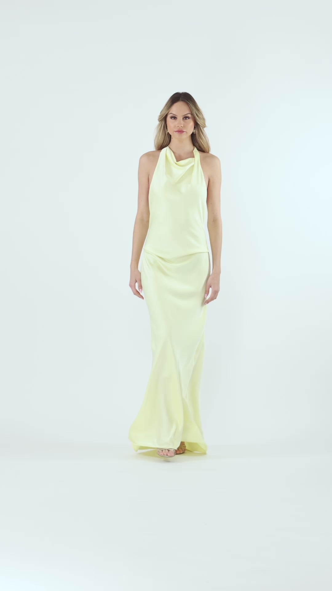 A sleek halter gown crafted in silky satin with a softly draped neckline and fluid, body-skimming silhouette. Minimalist and refined, this floor-length design moves effortlessly and delivers timeless elegance for formal events, weddings, or evening occasions.