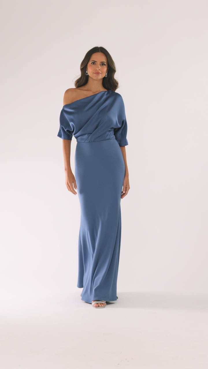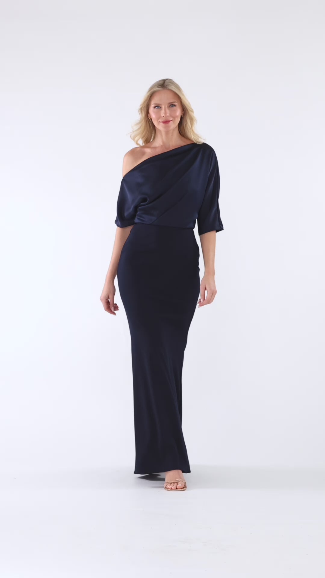 "Ana" Scuba Crepe Satin Drop Shoulder Floor Length Dress