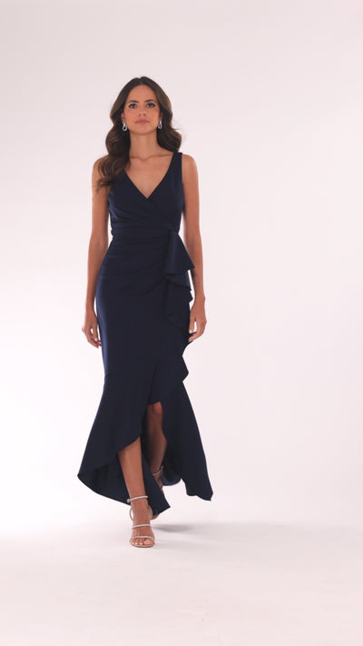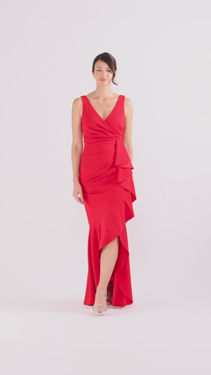 - Details: V-Neck, Rouched Side, Ruffles, High Low, Cascade Skirt