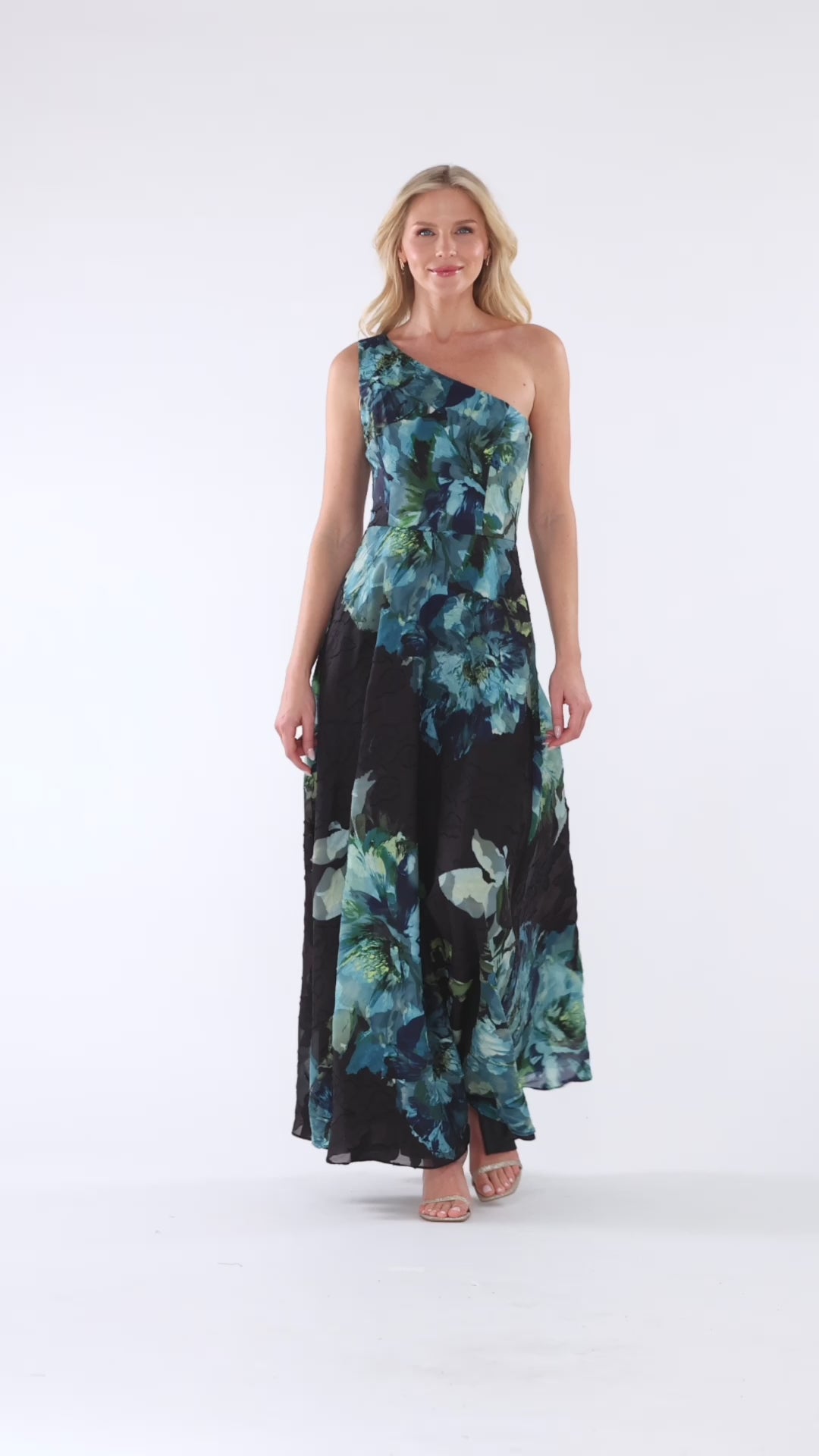 This elegant floor-length gown features a stylish one-shoulder neckline and an allover floral print for a refined, feminine look. Designed with a fitted bodice that flows into a graceful skirt, it offers effortless movement and a flattering silhouette, making it a beautiful choice for weddings, galas, and formal evening occasions.