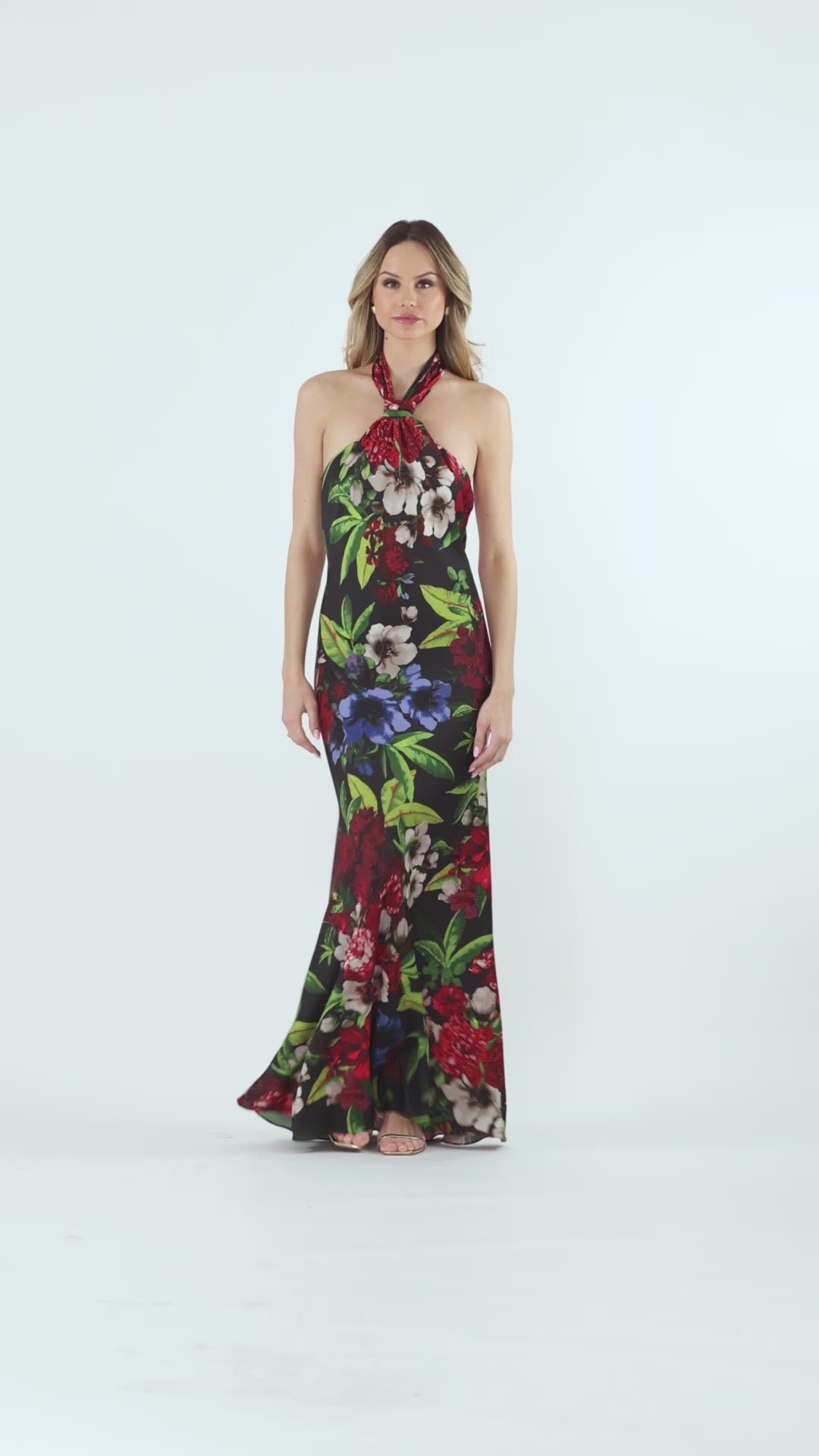 This striking halter gown showcases a vibrant floral print in rich shades of red, blue, ivory, and green. The neckline features a chic keyhole detail with a gathered halter tie, highlighting the shoulders and elongating the silhouette. Crafted from smooth, flowing fabric, the fitted bodice gently skims the figure before cascading into a sleek, floor-length skirt. Perfect for formal events, destination weddings, or elegant evening occasions.