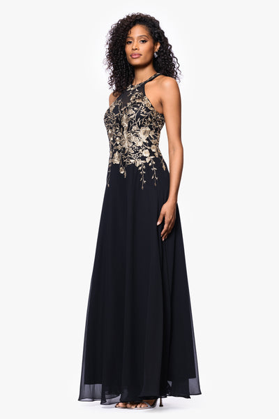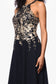 A embellished gold bodice beautifully contrasts with the full tulle skirt on this ballgown, mixing modern sensibilities with timeless elegance.
