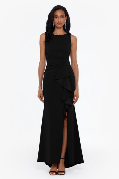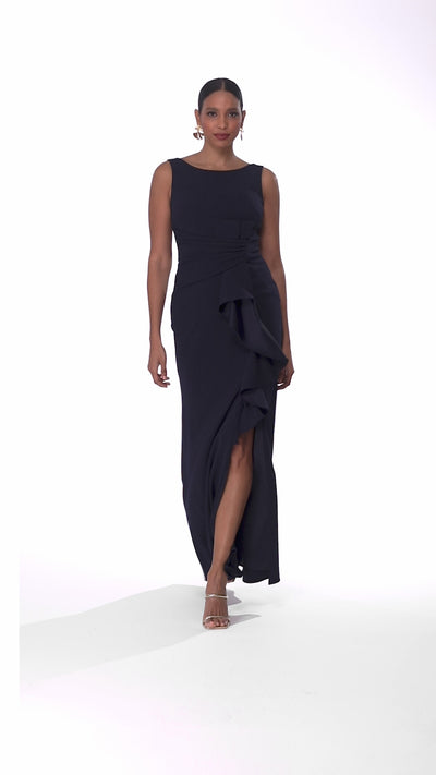 Take a bold step into the unknown with the "Christine" Scuba Crepe Ruffled Bow Gown. Made with durable scuba crepe material, fully lined for comfort and confidence. Hidden back zipper for a seamless fit. Features a boat neck, ruffled bow, and daring slit. Reach for new heights and shine in this dress!