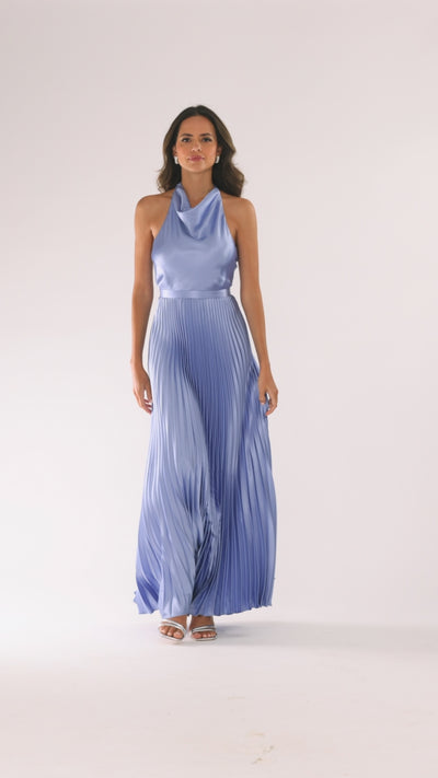 "Claire" Satin Tie Neck Pleated Skirt Floor Length Dress