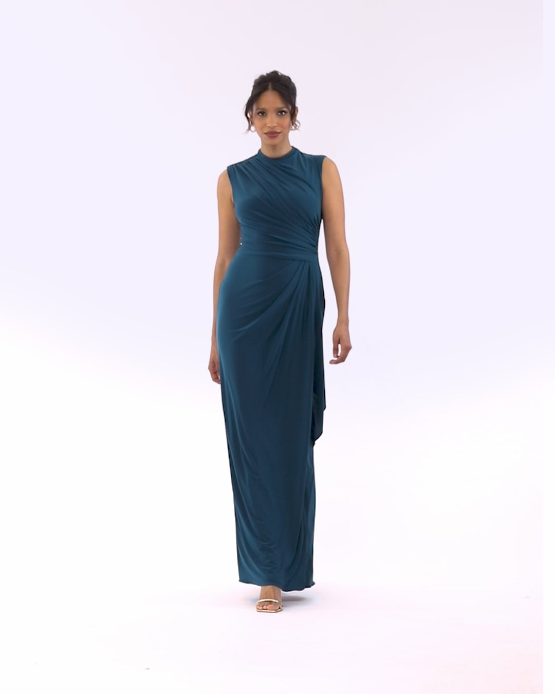 The "Patricia" Long Jersey Knit Ruffle Sleeveless Dress is a chic and versatile addition to any wardrobe. Crafted from soft jersey knit fabric, it offers both comfort and style with its elegant ruffle detailing along the sleeves. Perfect for both casual outings and special occasions, this dress effortlessly combines sophistication with a relaxed vibe.