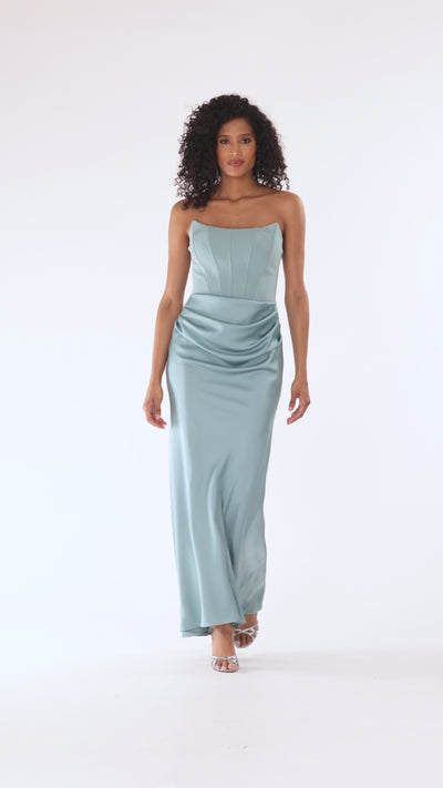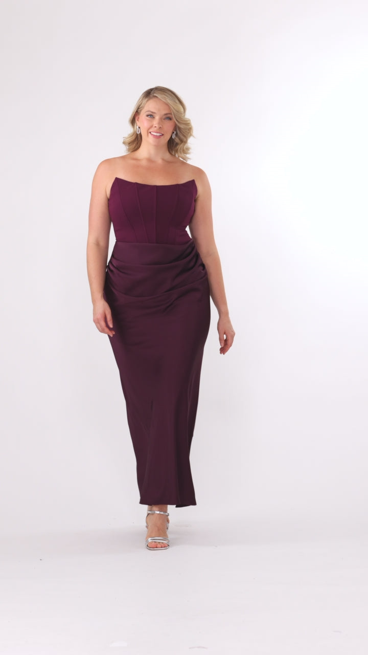 This strapless gown is a vision of sleek sophistication, featuring a structured bodice that beautifully highlights the neckline. The flowing satin skirt drapes gracefully for a polished silhouette, exuding understated elegance. Ideal for formal events, this gown seamlessly combines timeless appeal with a modern touch.