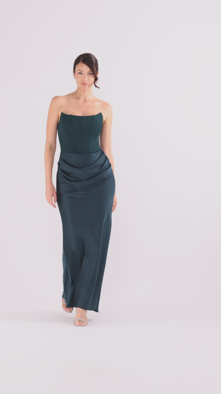 This strapless gown is a vision of sleek sophistication, featuring a structured bodice that beautifully highlights the neckline. The flowing satin skirt drapes gracefully for a polished silhouette, exuding understated elegance. Ideal for formal events, this gown seamlessly combines timeless appeal with a modern touch.