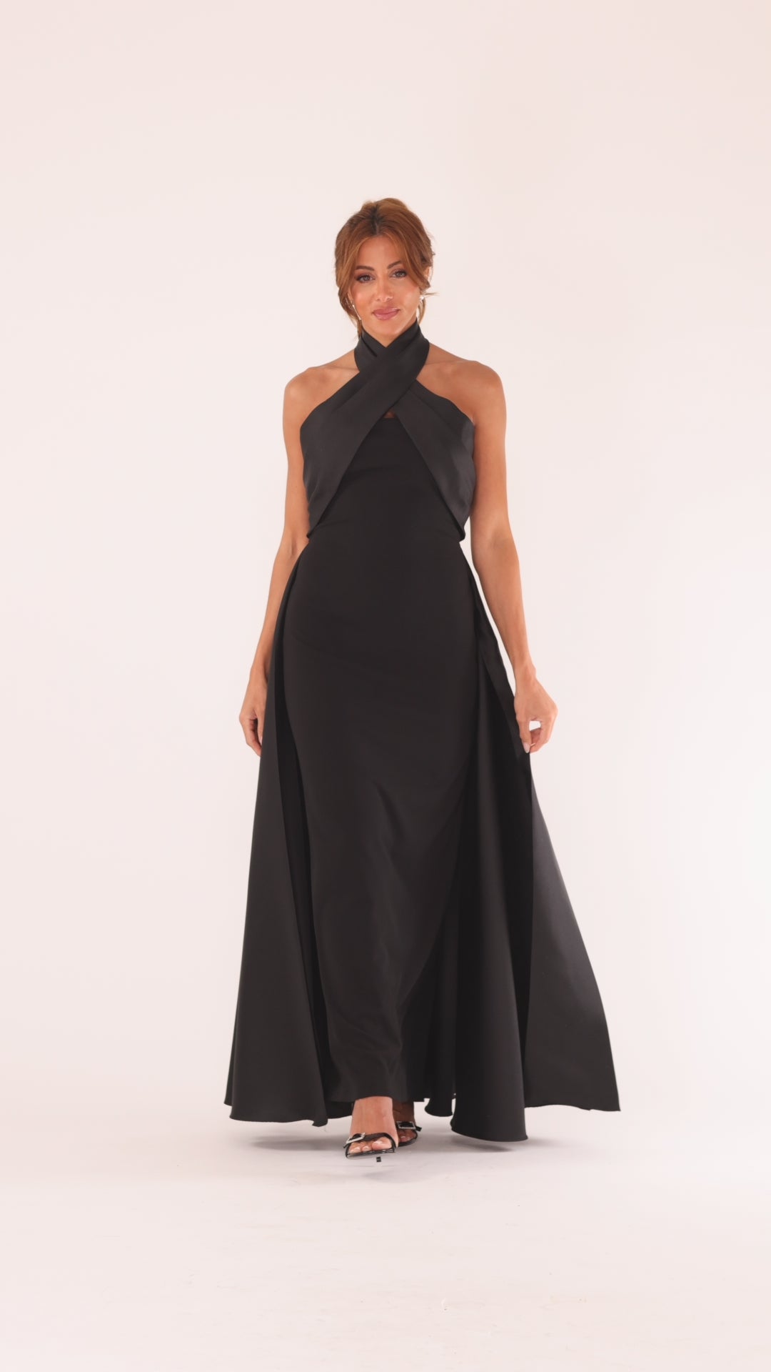 "Dina" Scuba Crepe Twist Halter Neck Floor Length Gown