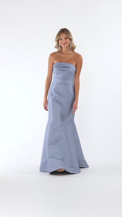 This timeless strapless floor-length gown is crafted from luxurious mikado fabric, offering a structured yet refined look. Featuring a clean, tailored bodice and a smooth flared skirt, it creates an elegant silhouette with modern polish, making it an ideal choice for weddings, galas, and formal evening events.