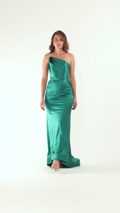 This elegant floor-length gown features a strapless design with an asymmetrical neckline, perfectly blending modern structure with timeless grace. Crafted from smooth satin, it offers a refined silhouette that flows effortlessly, making it ideal for formal occasions where a sophisticated presence is desired.
