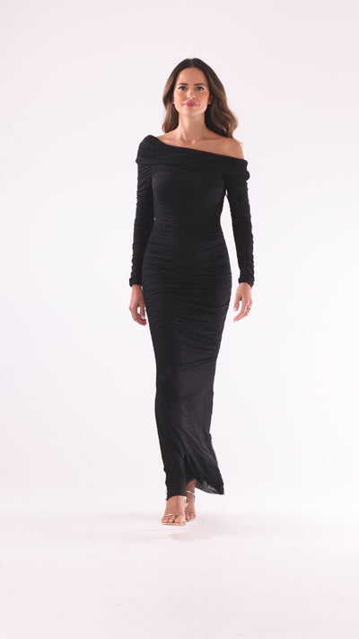 "Hannah" Mesh Rouching Drop Shoulder Long Sleeve Dress