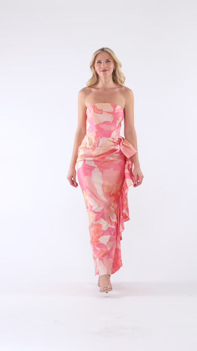 This strapless gown features a vibrant coral and blush floral print with subtle metallic accents for added dimension. The fitted bodice flows into a sleek column skirt, highlighted by a dramatic side ruffle detail that adds movement and modern elegance to this statement-making design.