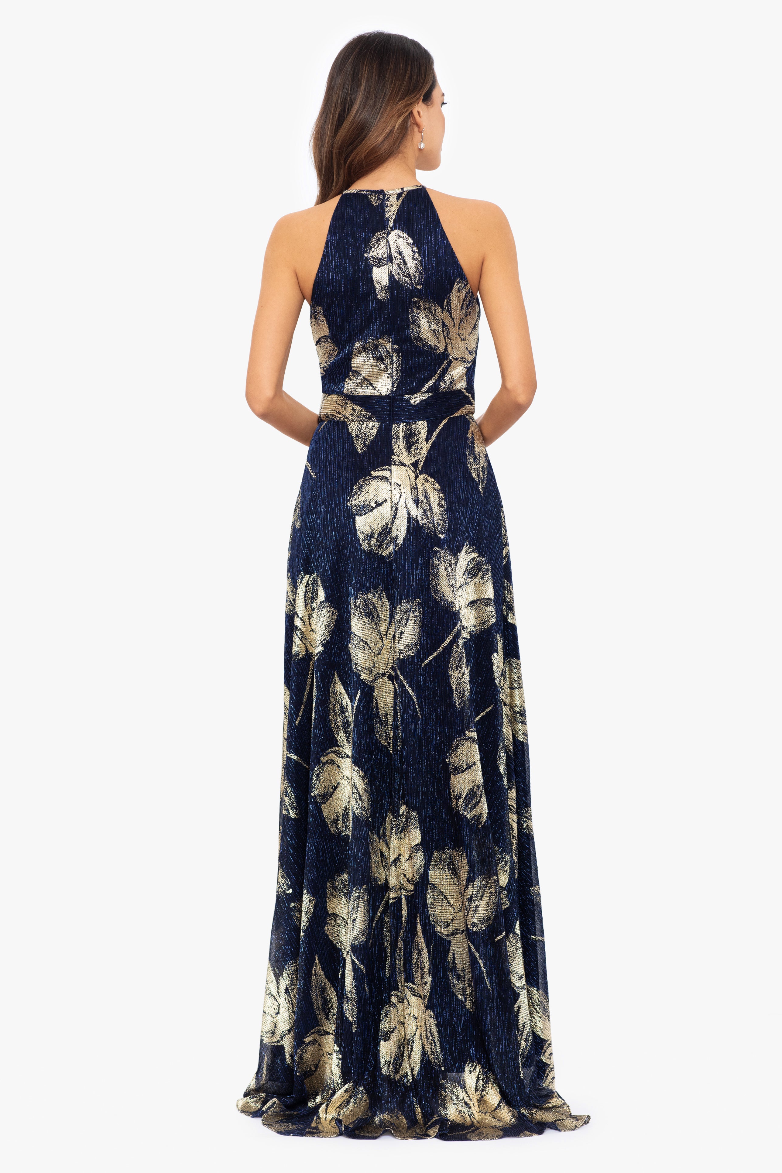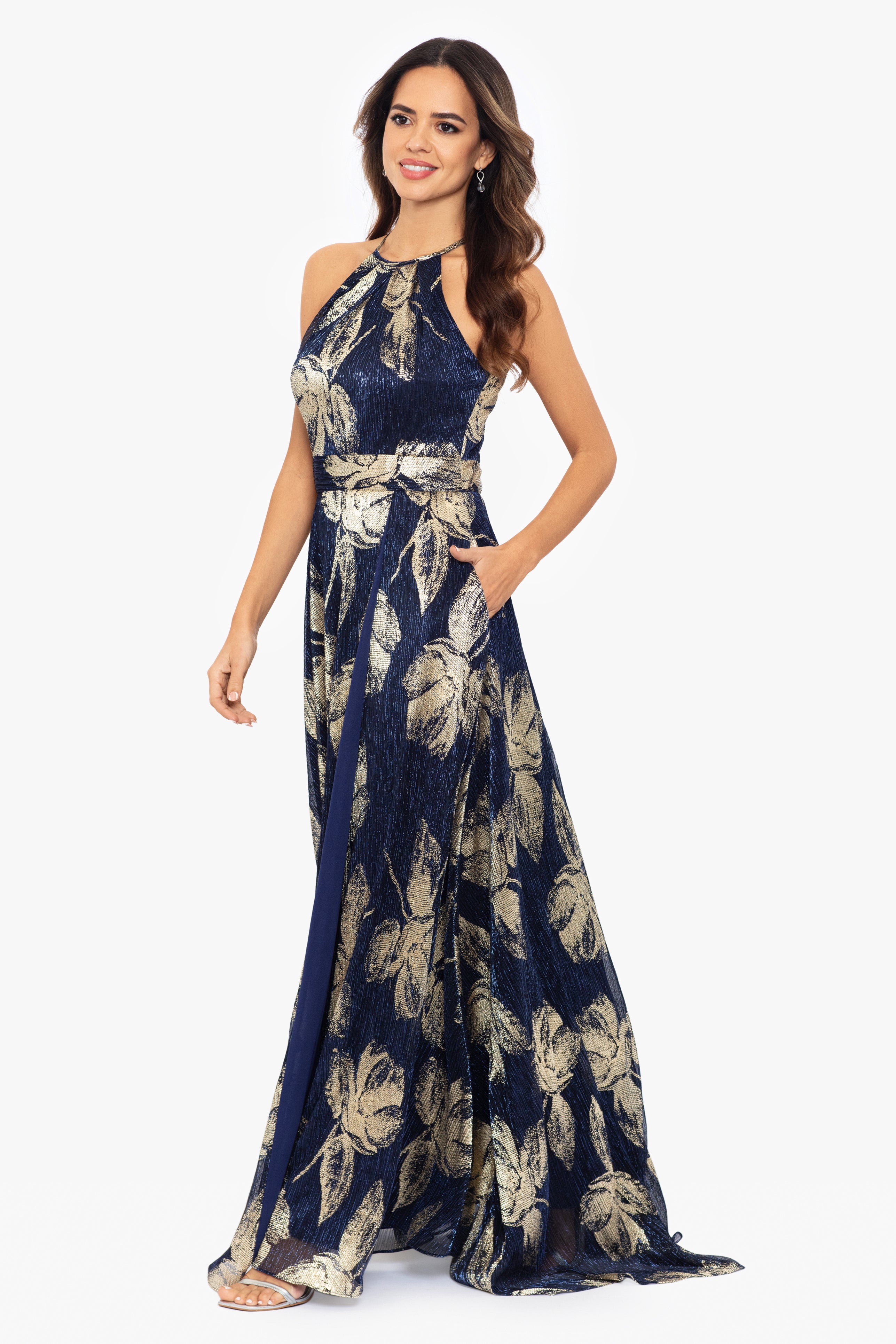 Release your inner diva with the "Ilaria" Long Halter Foil Print Dress. This metallic foil dress features a fully lined halter top with a hidden back zipper for a seamless look. The cinched waist and long gown style will have you feeling like the star of the show. Shine on, darling.