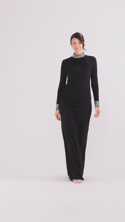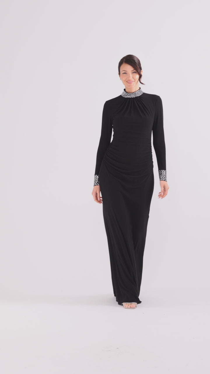 "Imani" Jersey Knit Long Sleeve Beaded Mock Neck Floor Length Dress