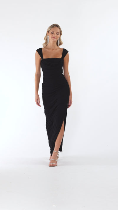 - Details: Square Neck, Leg Slit, Bodycon