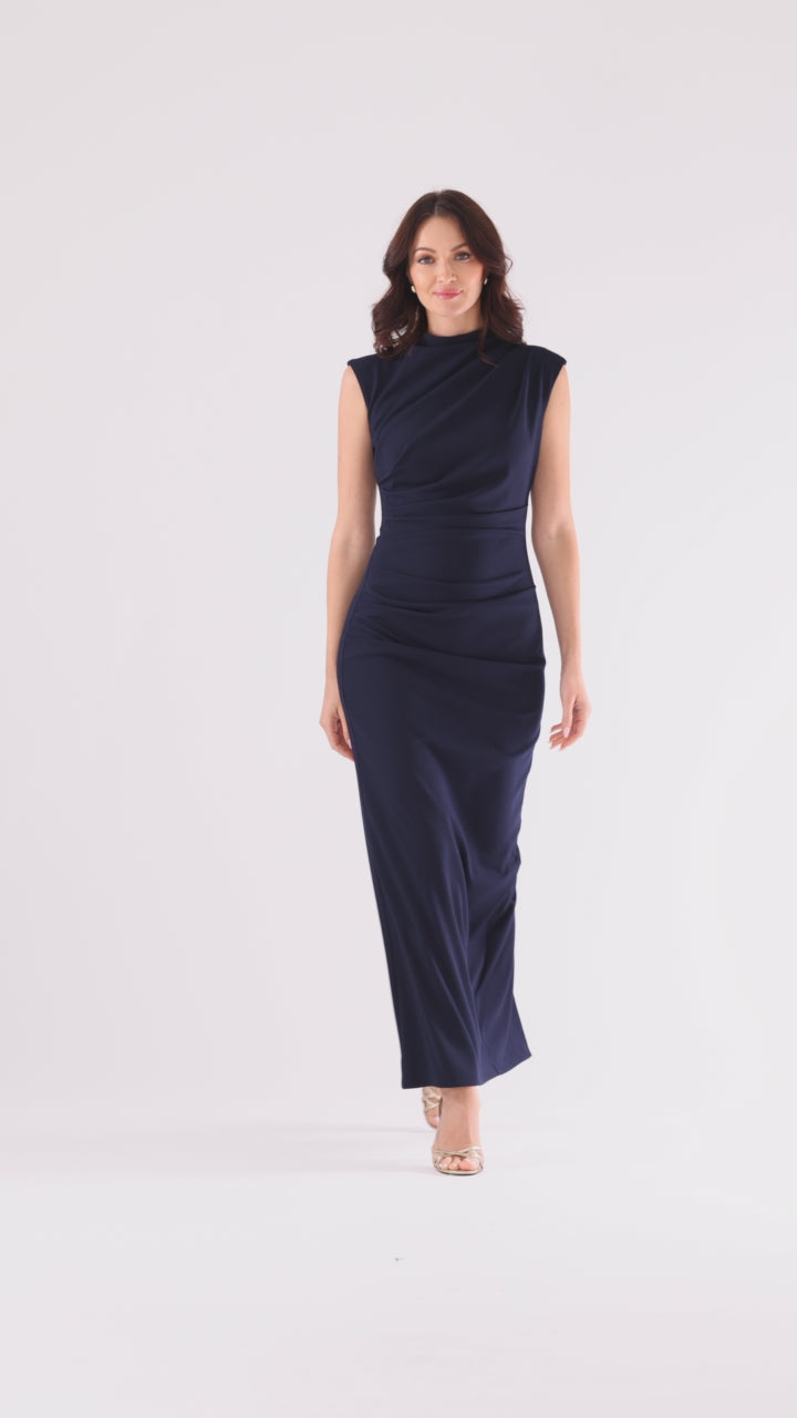Elevate your look in this sleek scuba crepe gown featuring a modern mock neckline, cap sleeves, and flattering ruching at the waist. The floor-length silhouette is minimal yet sculpted—perfect for formal evenings, weddings, and black-tie events.