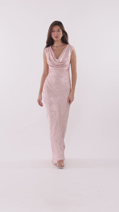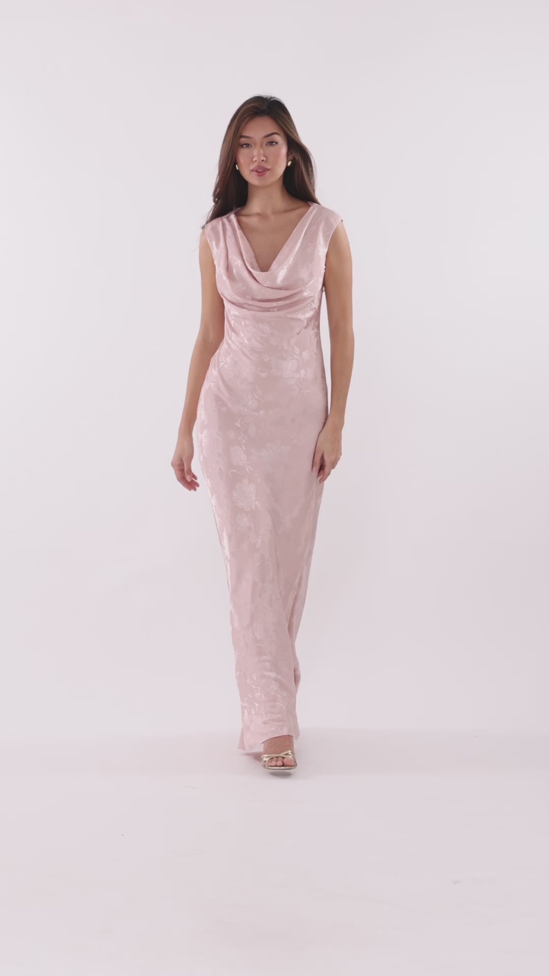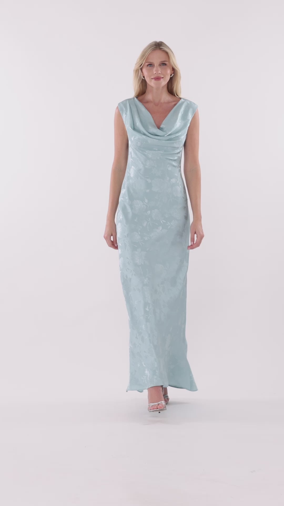 Graceful and refined, this floor-length gown features a soft cowl neckline, cap sleeves, and a subtle floral jacquard pattern. The smooth satin silhouette skims the body for an elegant, timeless look perfect for weddings, galas, and formal evenings.