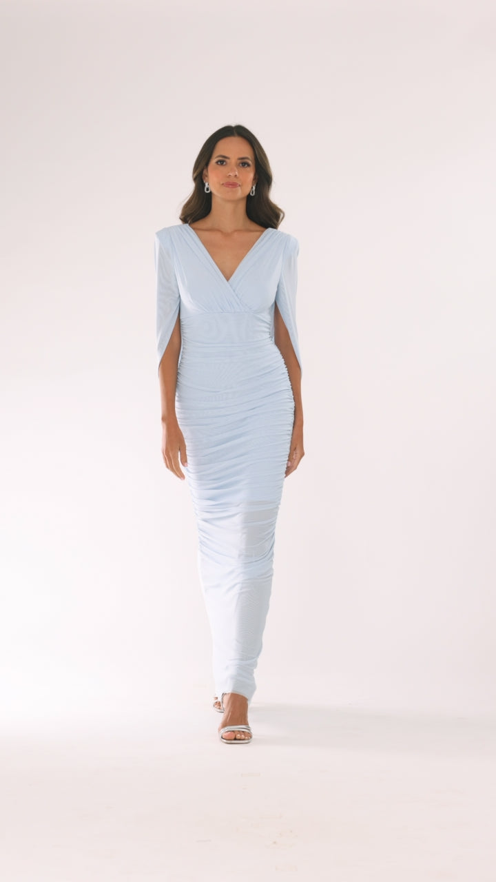 This elegant floor-length dress features a sophisticated silhouette crafted from powermesh fabric that drapes beautifully against the body. The flattering V-neckline creates a refined focal point, while the dramatic cape back sleeves add an unexpected touch of glamour and movement. An ideal choice for those seeking understated elegance with modern design details.