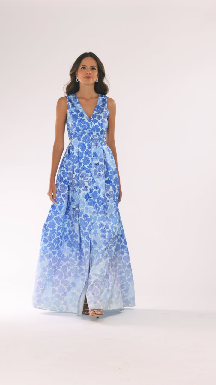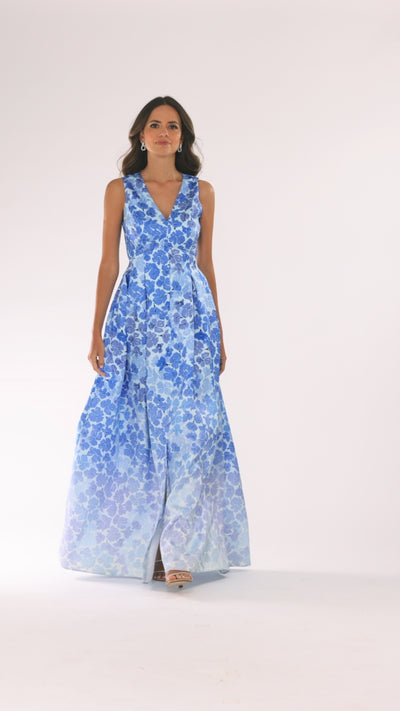 A romantic sleeveless gown featuring a flattering V-neckline and tailored waist. The full-length skirt flows beautifully with an allover floral pattern, creating a graceful silhouette that feels elegant and feminine, perfect for weddings, galas, and formal celebrations.