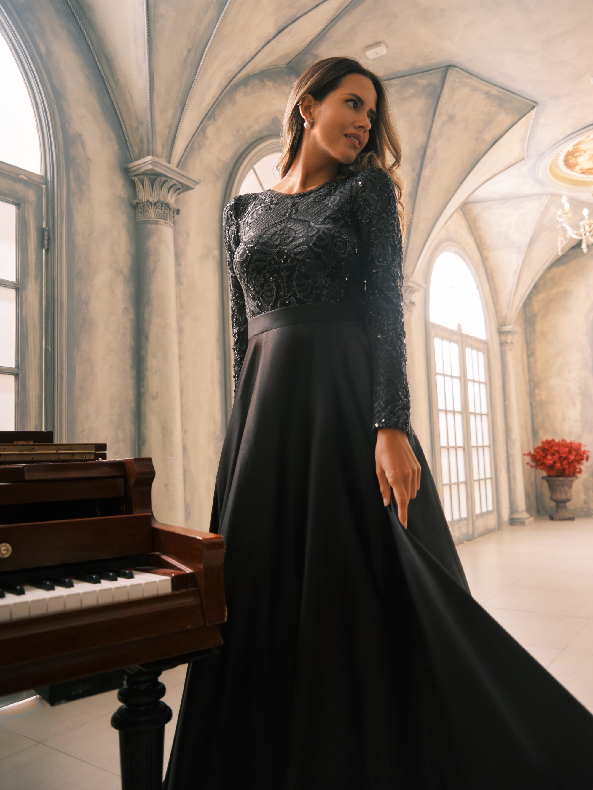 Details: Long Sleeve, Sequin Top, Aline Fit, Ballgown Dress