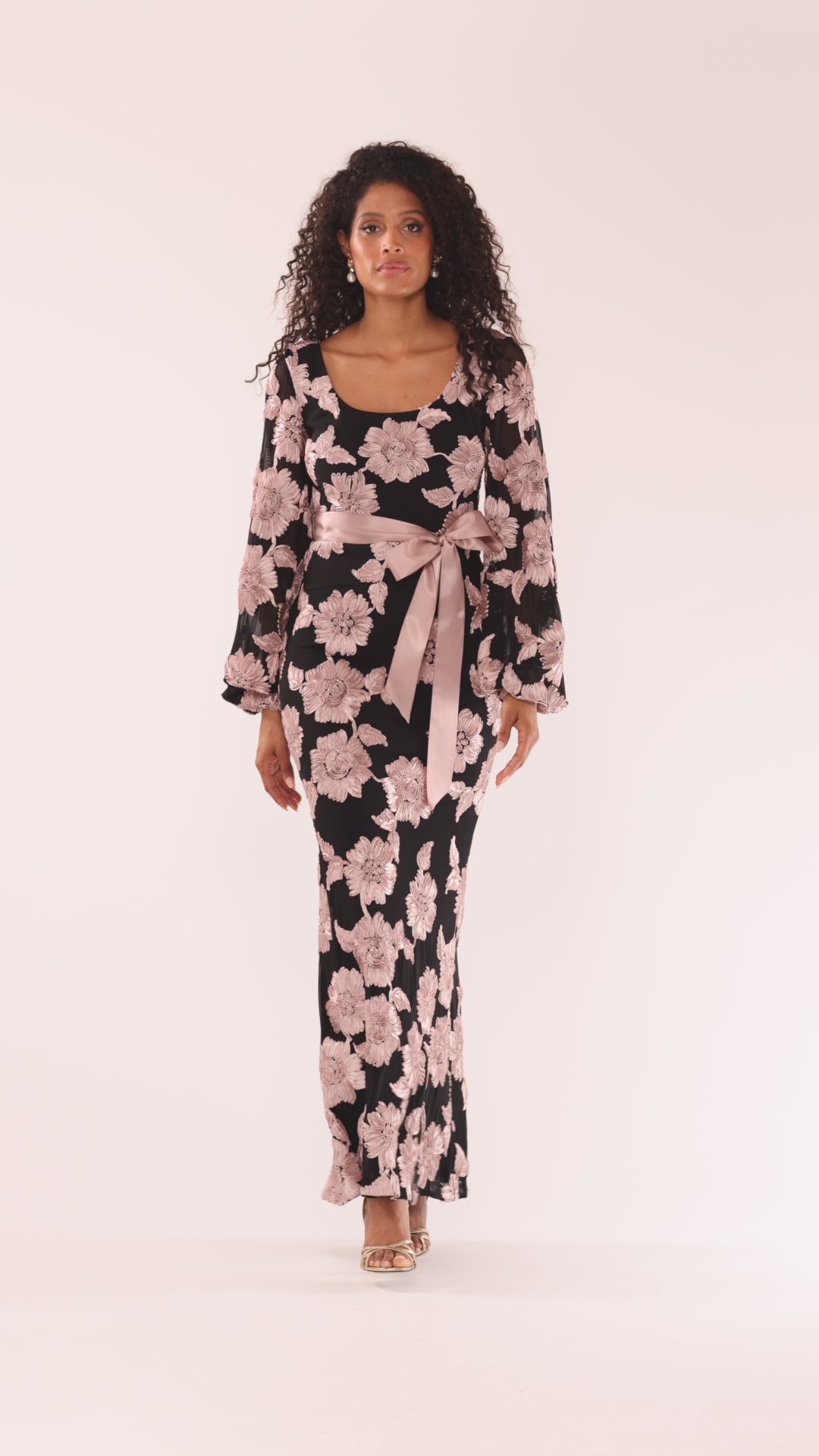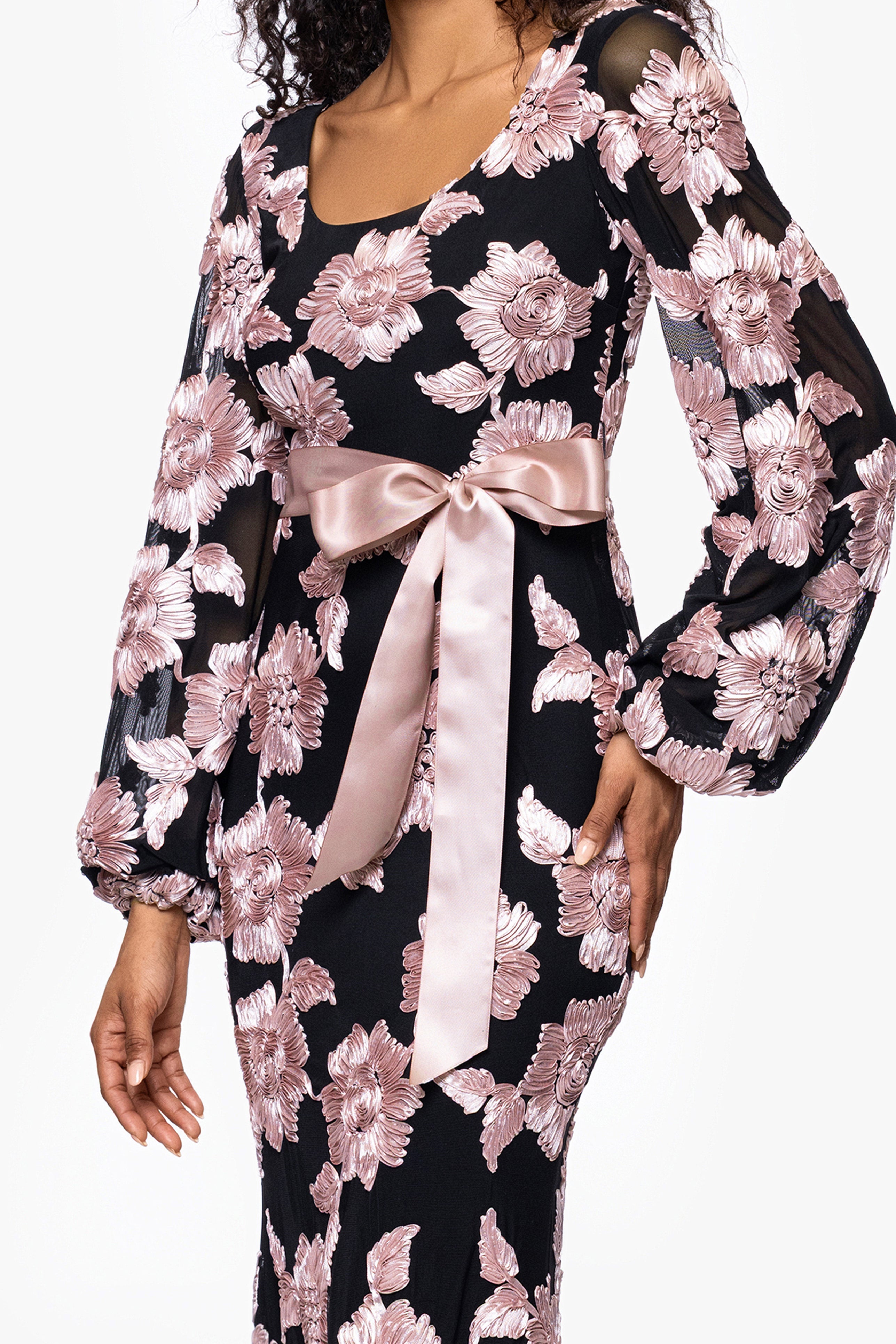 Make an entrance in this romantic embroidered gown featuring dimensional floral appliqué, sheer balloon sleeves, and a satin ribbon sash. The fitted silhouette and scoop neckline add timeless charm—perfect for weddings, galas, or formal celebrations.