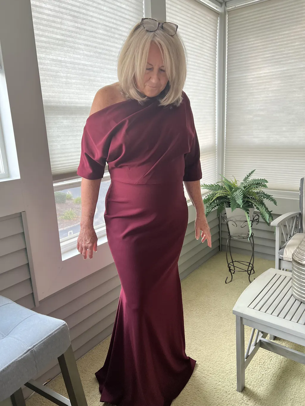 "Madeline" Long Scuba Crepe Off the Shoulder Drop Dress