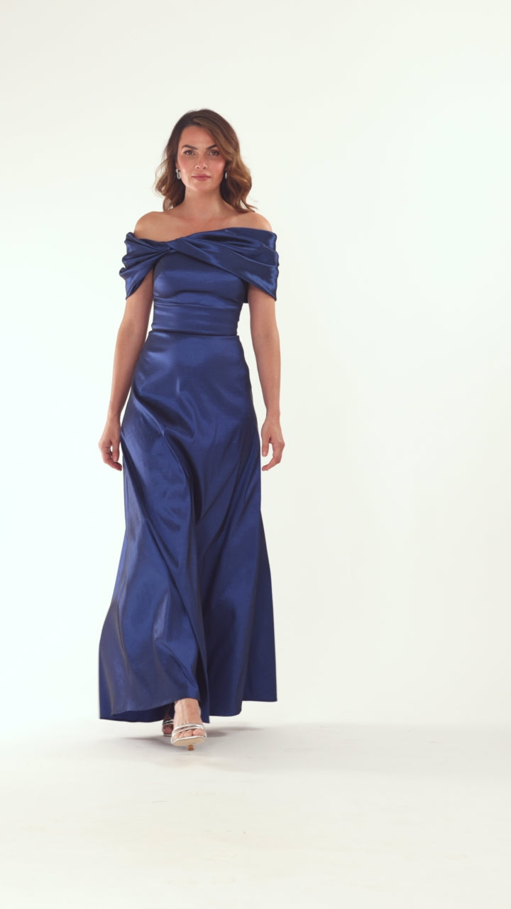 An exquisite off-the-shoulder gown crafted from sumptuous taffeta fabric. The twisted neckline detail adds architectural elegance, while the floor-length silhouette creates a dramatic, graceful presence. Perfect for black-tie events and formal celebrations.