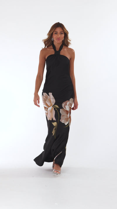An elegant halter gown featuring a softly draped neckline and sleek, floor-length silhouette. The bold floral print adds artistic flair against the dark backdrop, creating a refined yet statement-making look perfect for formal events, weddings, or evening occasions.