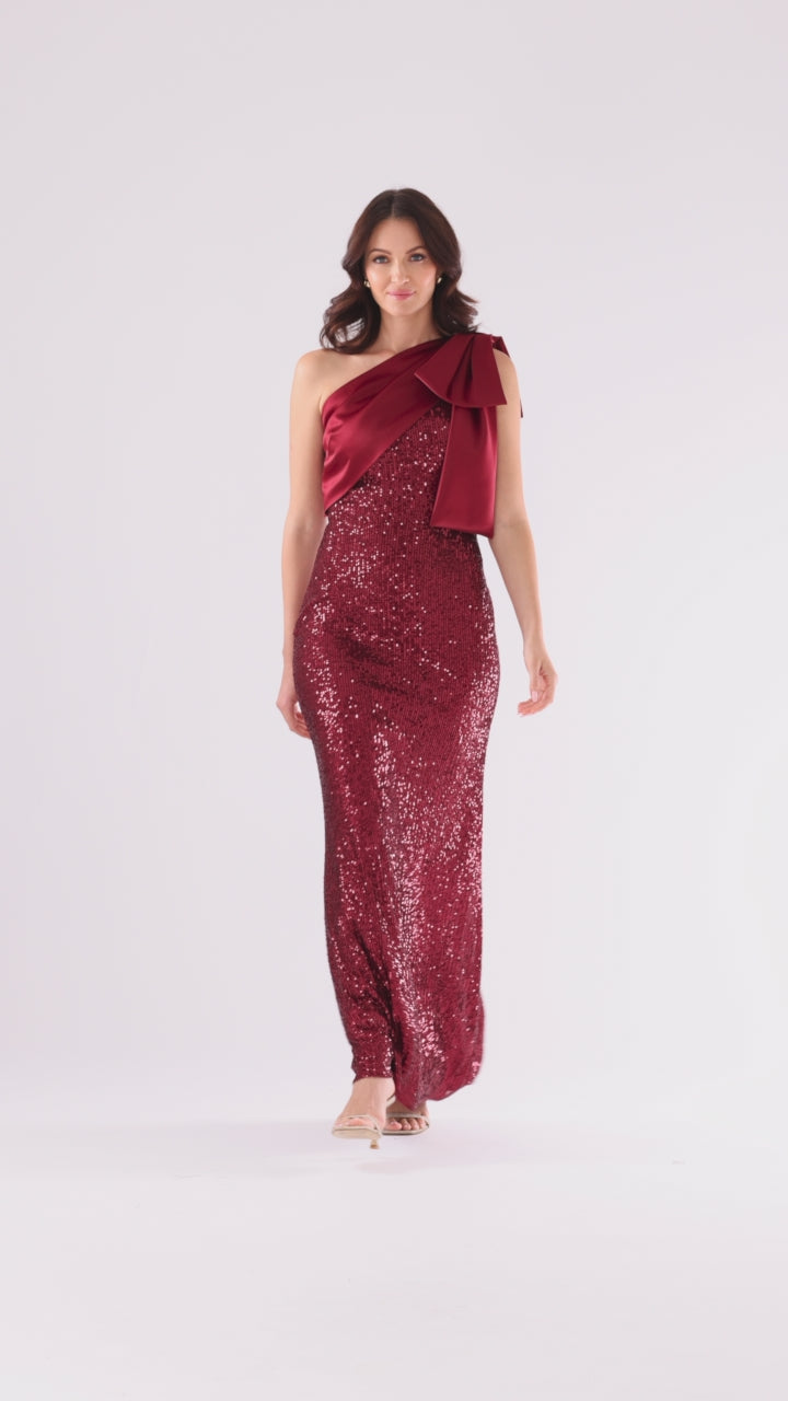 "Paulette" Long Sequin One Shoulder with Satin Bow Floor Length Dress