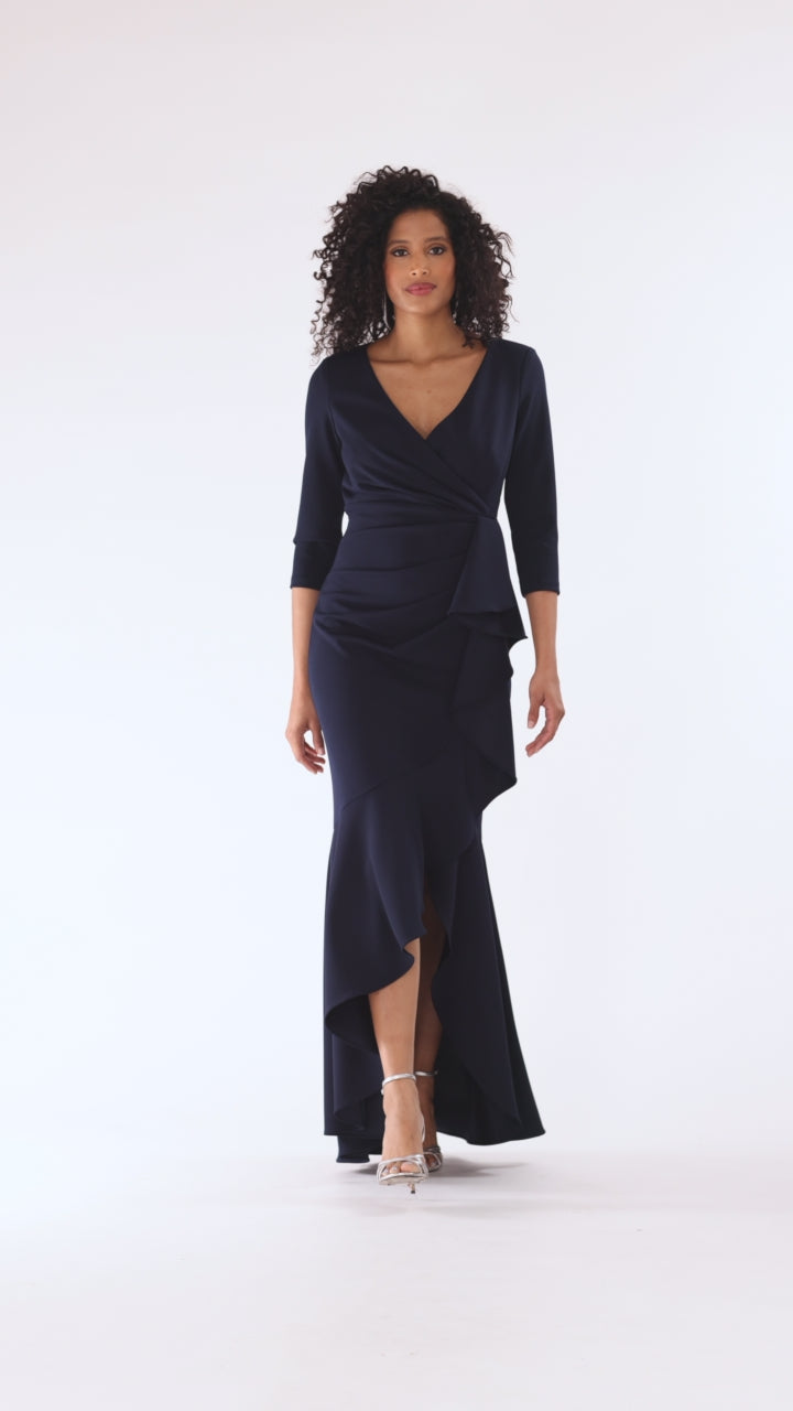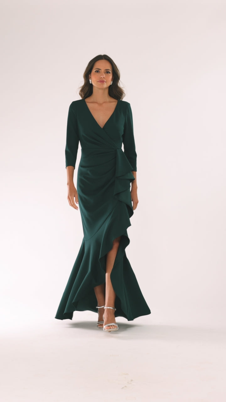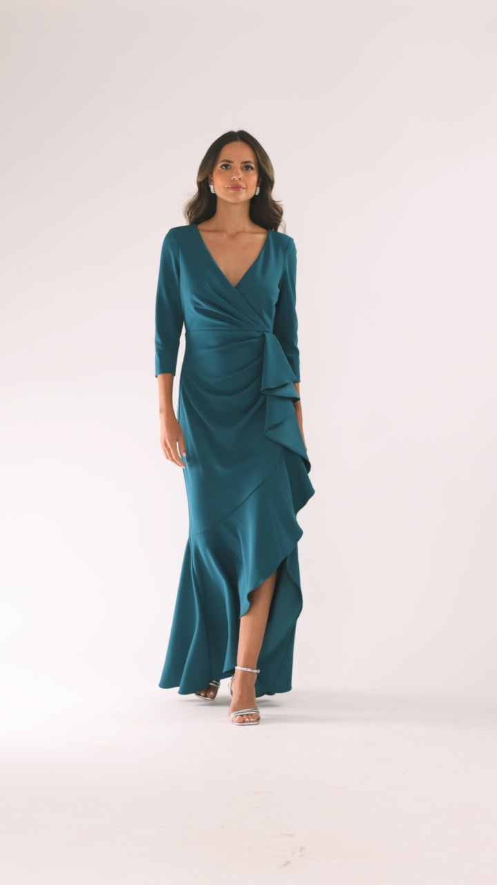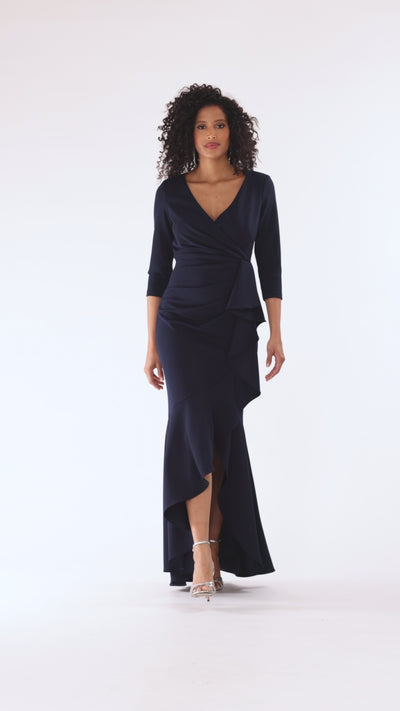 "Pauline" Scuba Crepe 3/4 Sleeve Ruffle Floor Length Dress