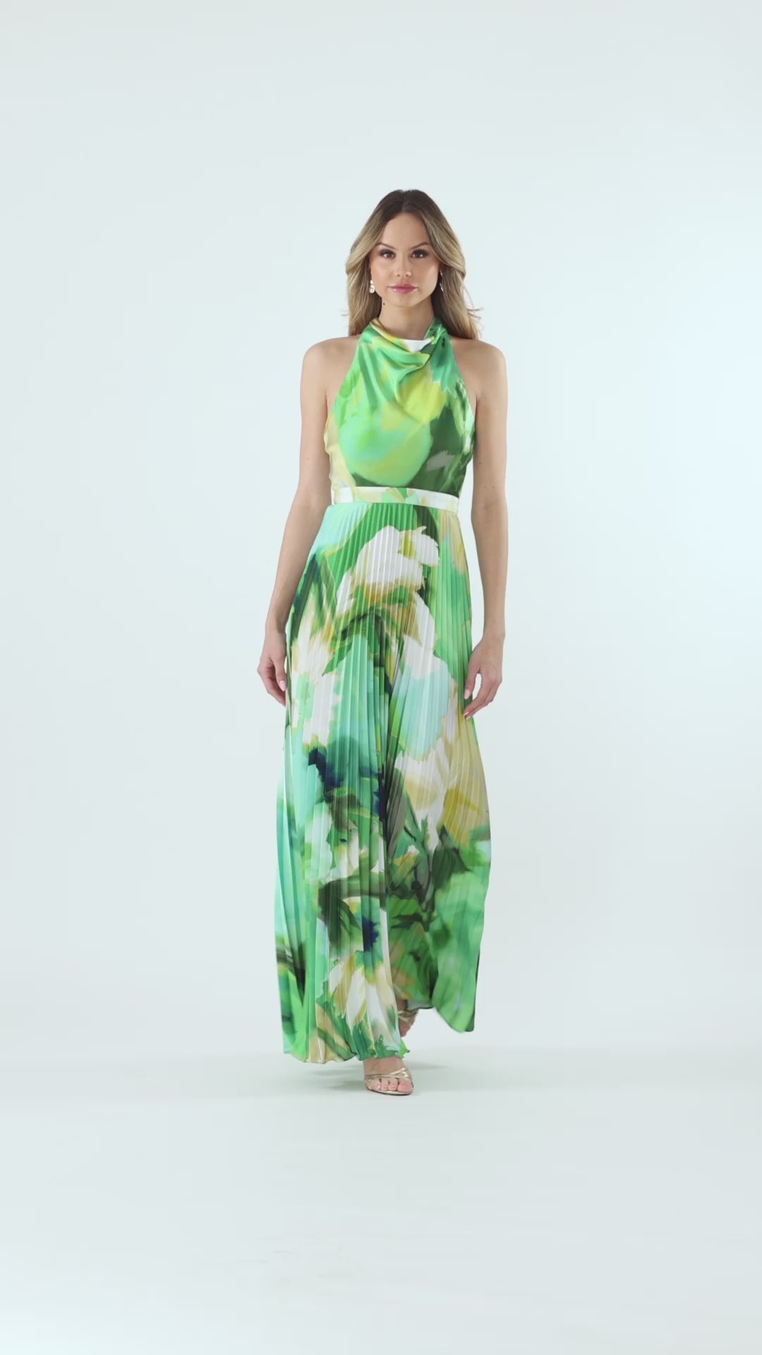 This stunning green multi halter gown features a softly draped neckline that elegantly frames the shoulders and collarbone. The bodice is defined by a subtle waistband that enhances the silhouette before flowing into a beautifully pleated, floor-length skirt. Showcasing an abstract floral print in shades of green, ivory, and hints of yellow, the lightweight fabric moves gracefully with every step. Perfect for garden weddings, formal events, or spring soirées.
