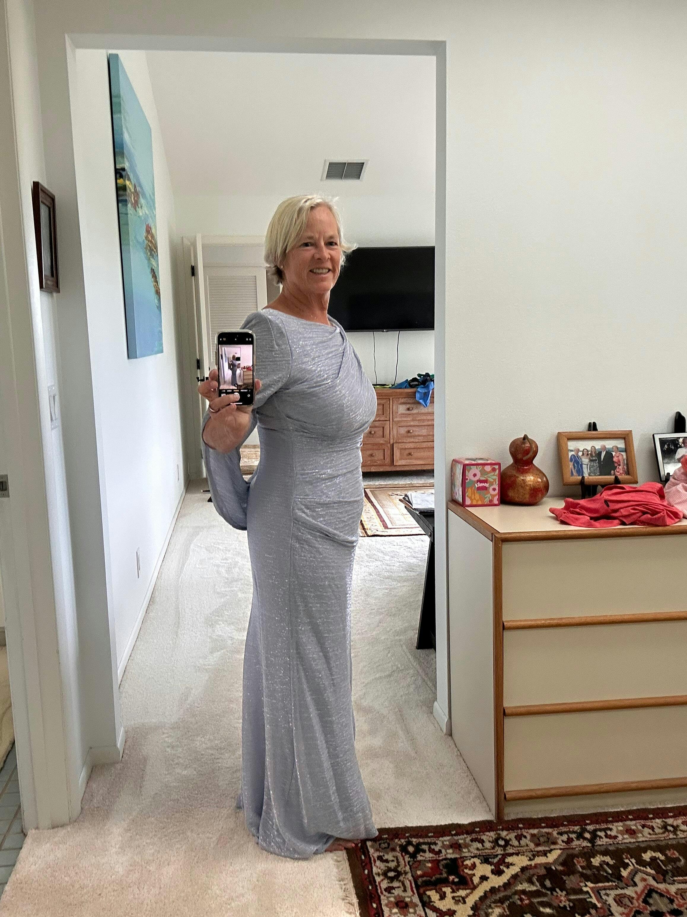 Slip into elegant style with our "Elaine" Long Metallic Crinkle Cowl Neck Back Dress. The shimmering metallic crinkle material adds a touch of glamour, while the fully-lined design ensures a comfortable fit. With a hidden back zipper and boat neck, cowl back neckline, this dress is the perfect choice for a special occasion.