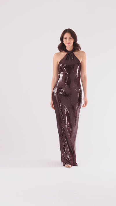 This floor-length dress features a halter neckline with an elegant knot detail, creating a refined silhouette. Adorned with shimmering sequins, it offers a captivating sparkle that enhances its sophisticated appeal. Perfect for formal occasions, this dress combines graceful design with eye-catching texture for a timeless, polished look.