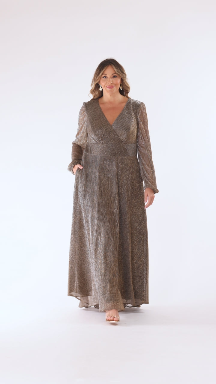 Sophisticated long sleeve dress with a flattering v-neckline and gracefully flowing skirt. The modest cut offers timeless elegance, while hidden pockets add practicality. Crafted in luxurious metallic knit for a refined, polished look.