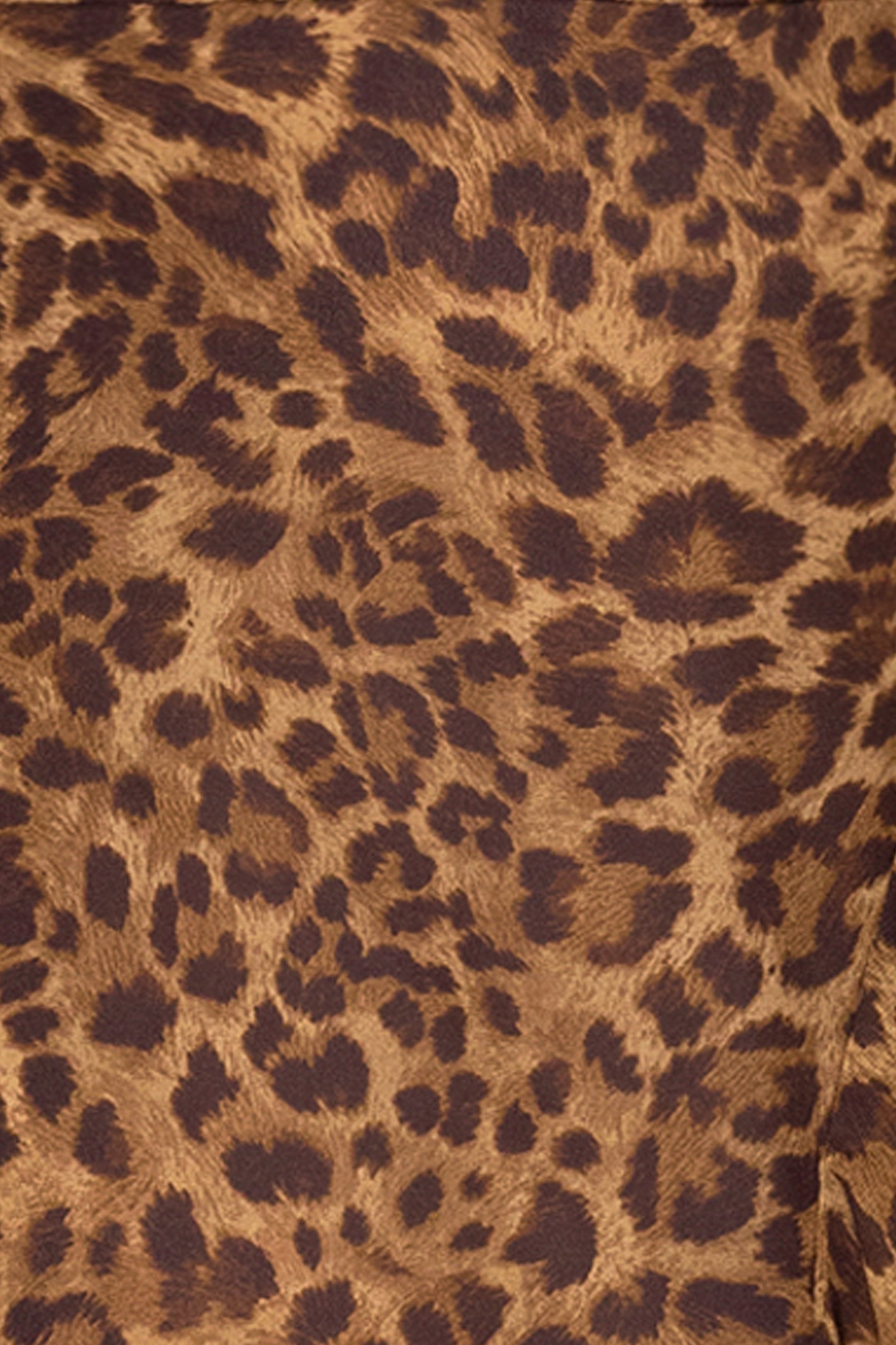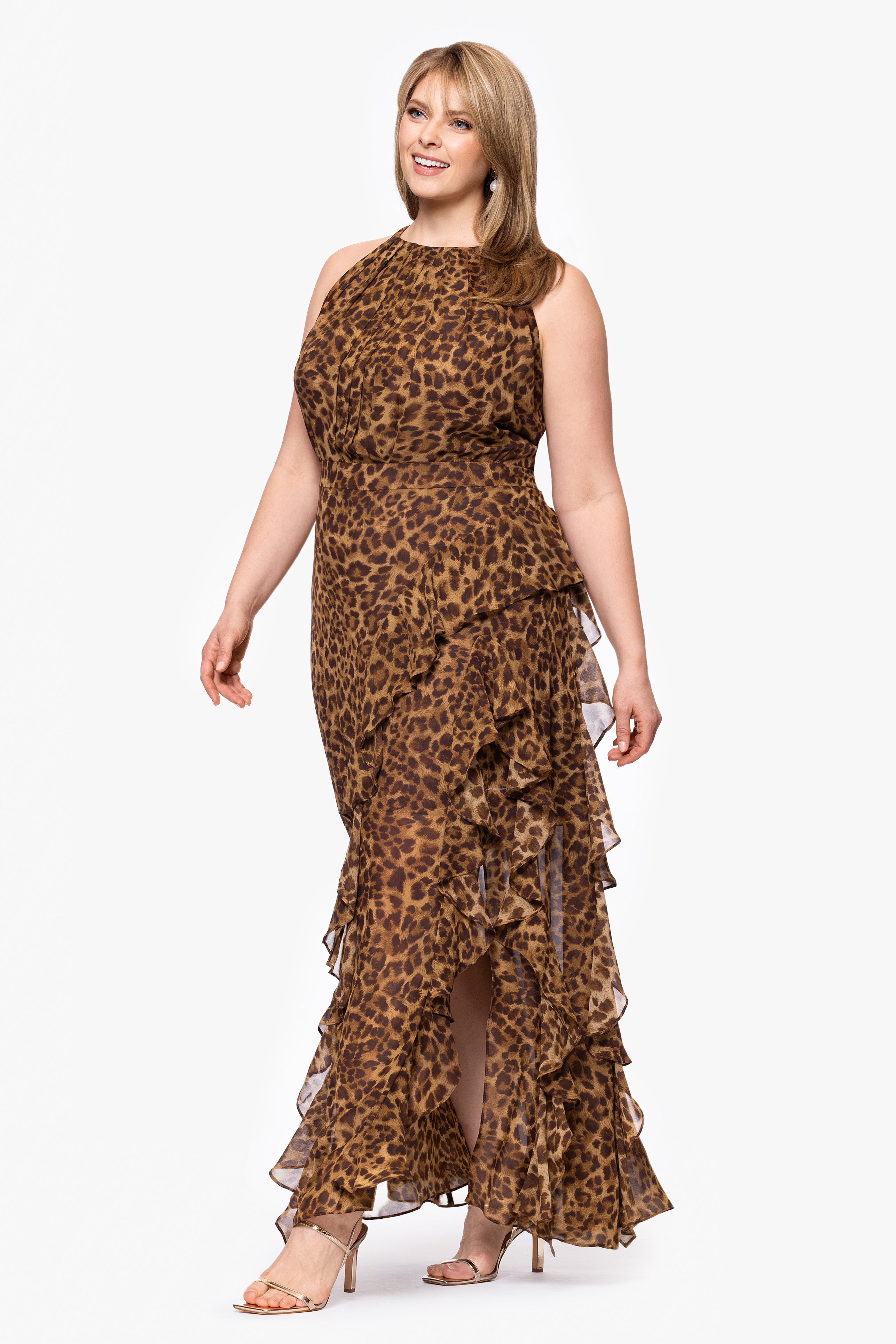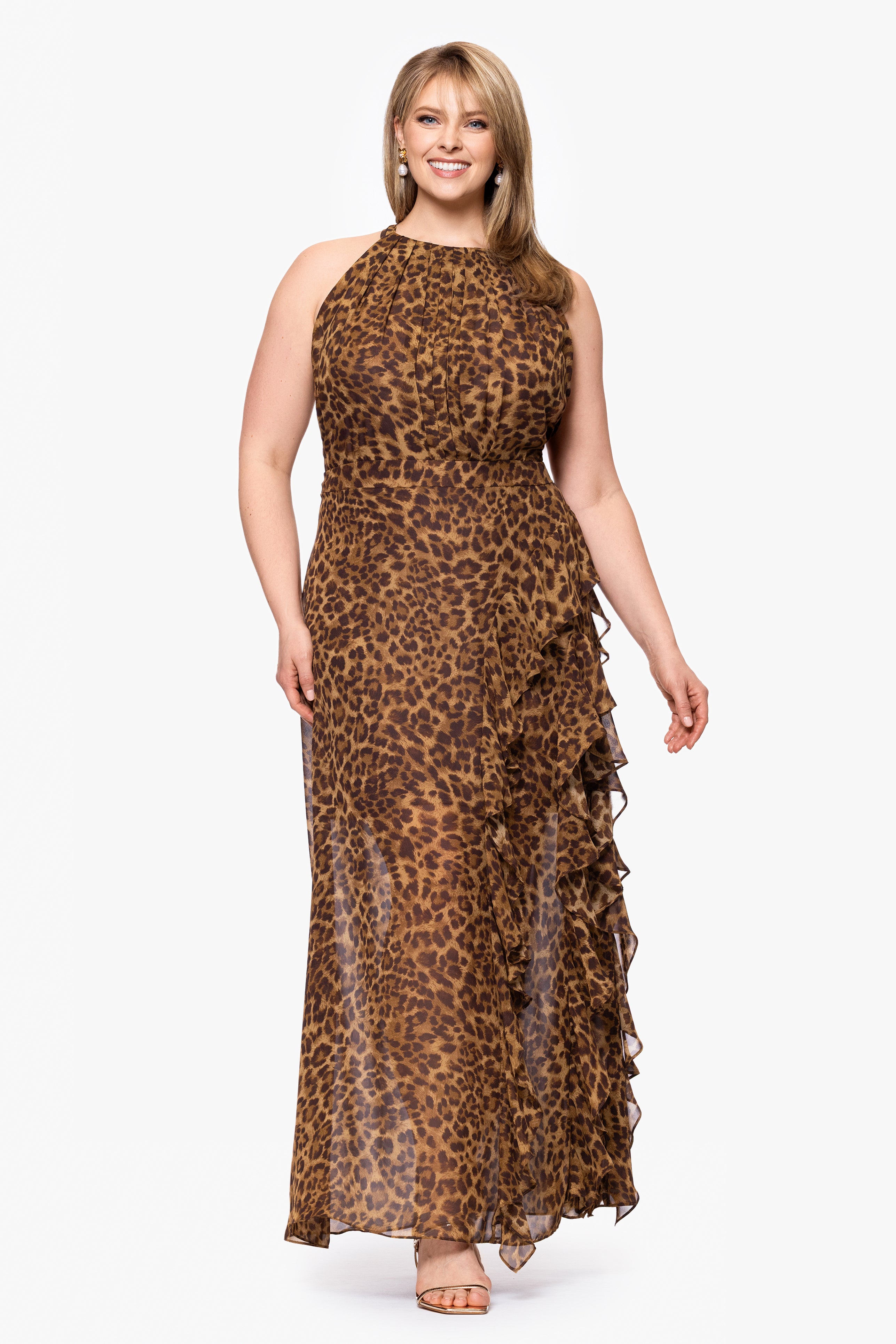 Unleash your wild side in this flowy animal print gown. A halter neckline and cascading ruffle add movement and drama, while the lightweight fabric keeps things breezy and bold. A fierce pick for weddings, vacations, or nights out.