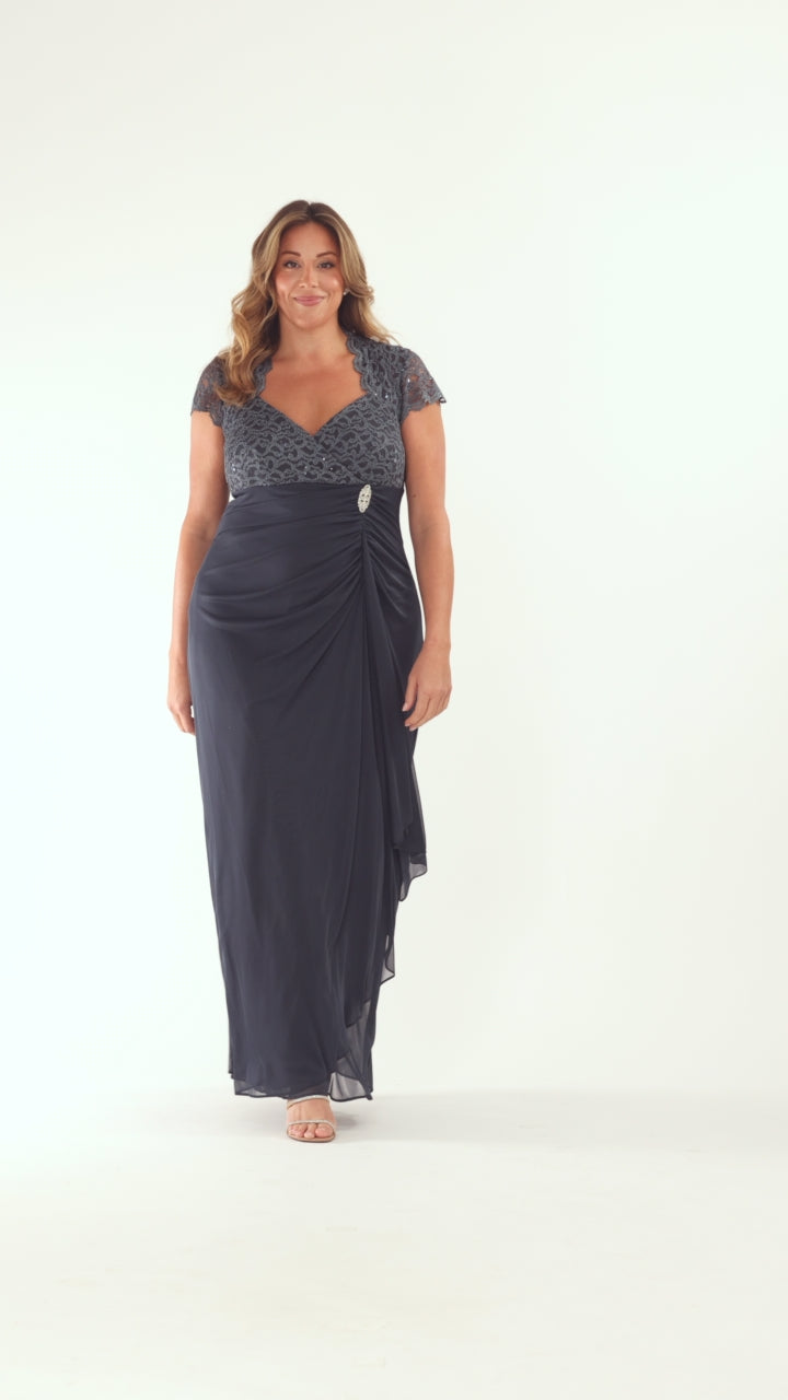 - Material: Sheer Matte Jersey, Lace Cap Sleeves